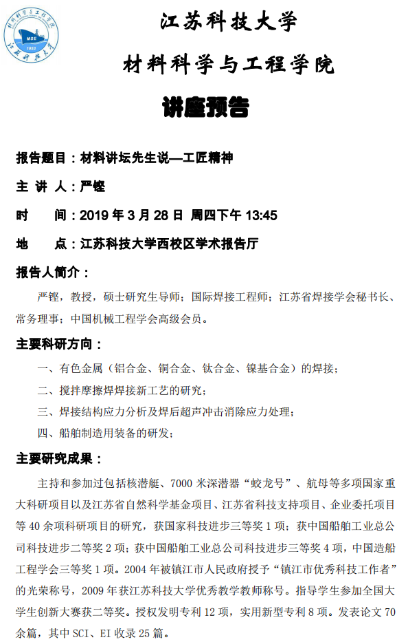 讲座预告|材料讲坛先生说--工匠精神(报告人:严铿 2019年3月28日)