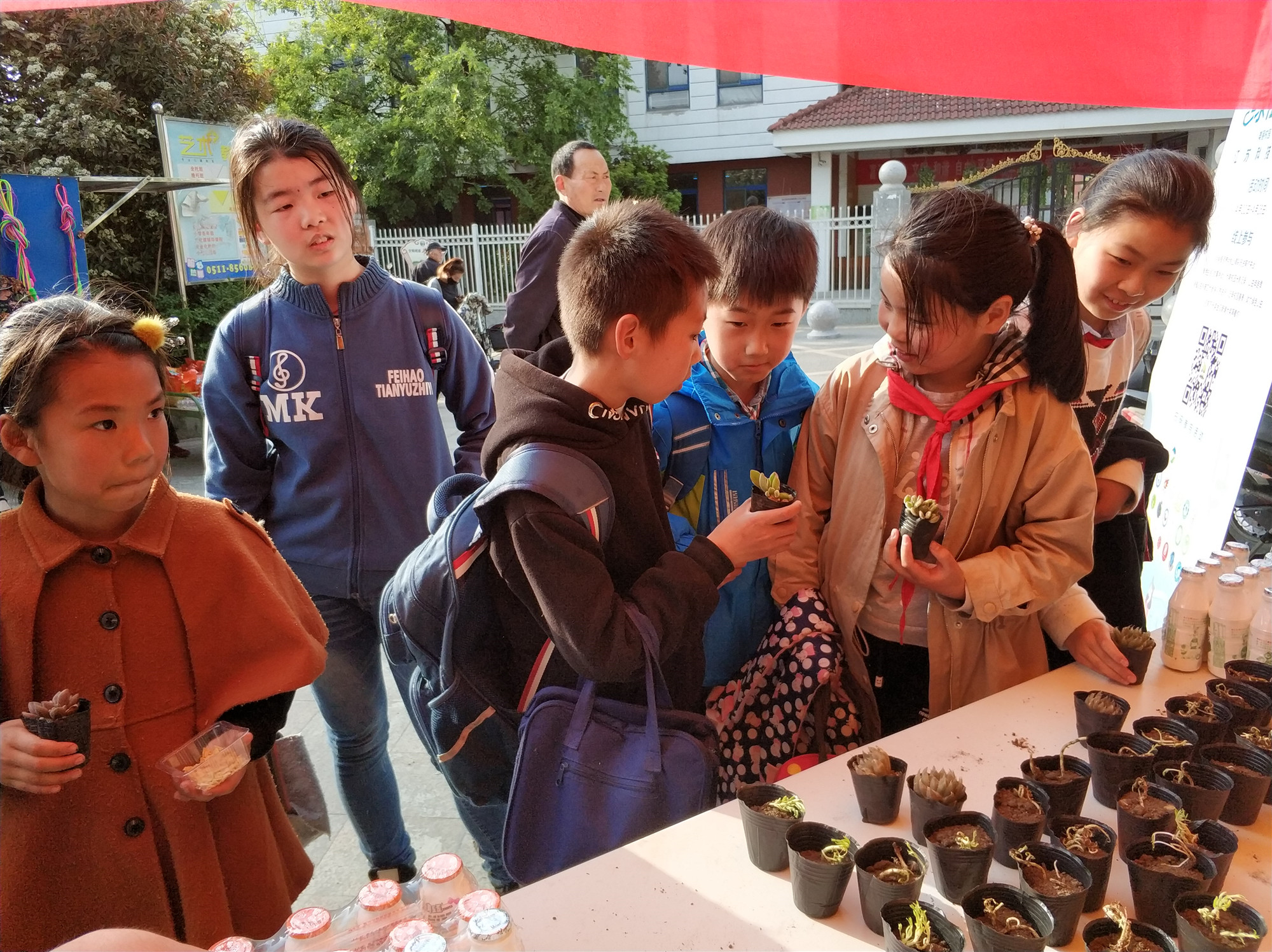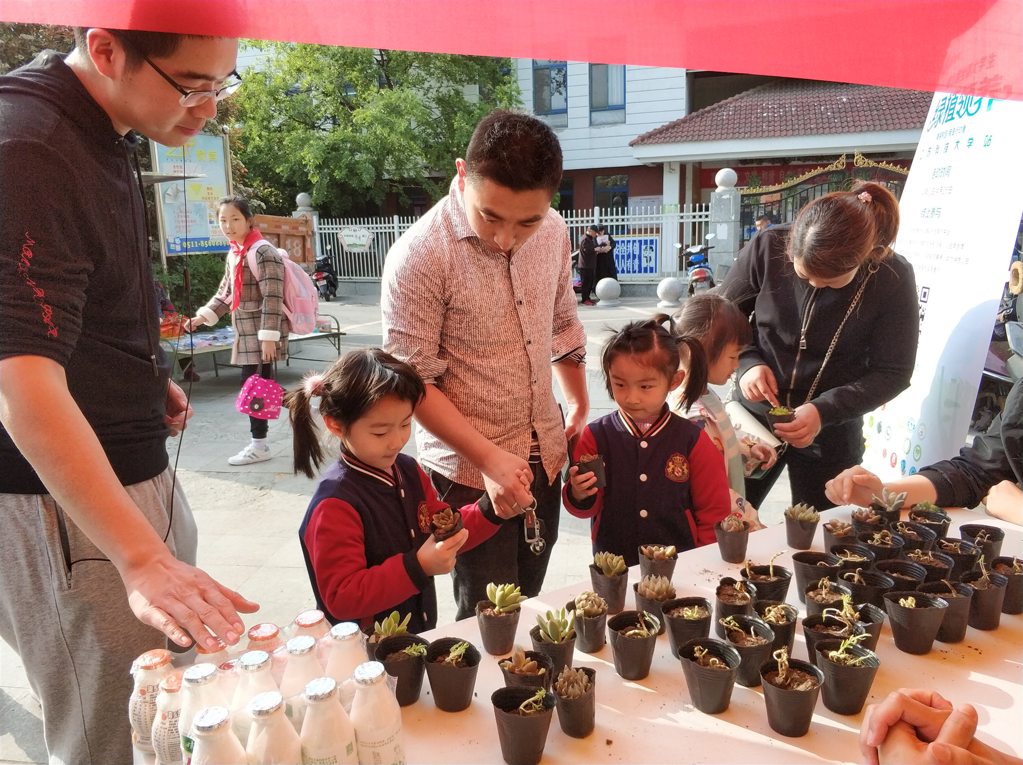活动开始前三周,校社联及蒲公英义工站志愿者们着手准备工作,从植株的移植、到盆栽的初期维护以及活动的宣讲都有条不紊地进行着。19日下午suncitygroup太阳集团社联志愿者们在朱方路小学对面摆好桌椅,搭起帐篷,挂起横幅,摆放好绿植。小朋友们放学后便纷纷围上前来,把那可爱的绿植小心地捧在手里,并仔细地听着志愿者们的讲解——如何去照顾它们手中“大自然的朋友”。同时也吸引了不少叔叔阿姨、爷爷奶奶前来领养。