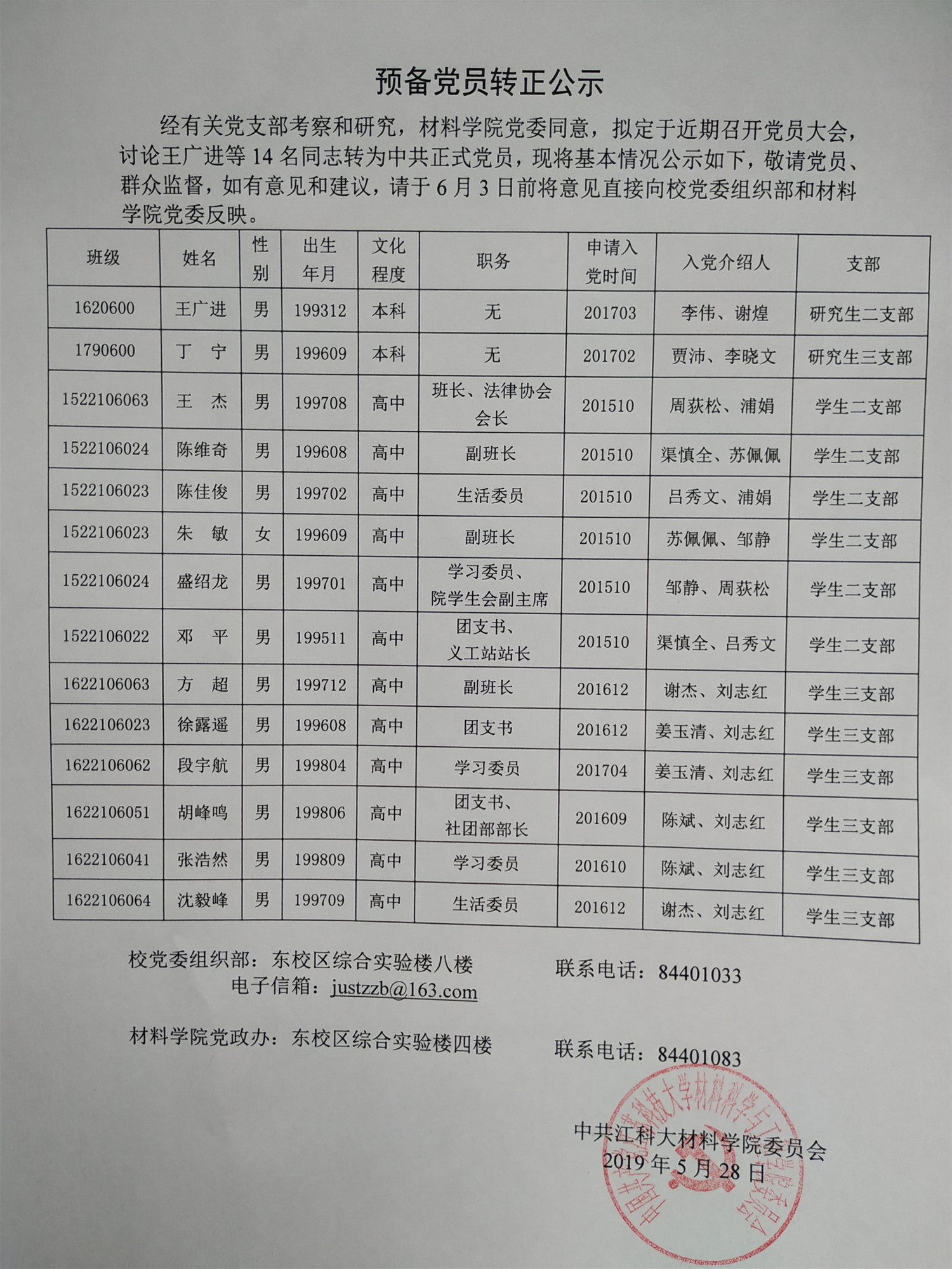 2019年上半年预备党员转正公示(2019年5月)
