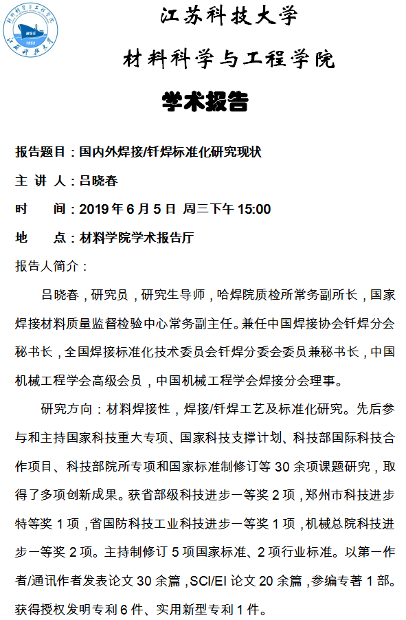 讲座预告|吕晓春:国内外焊接/钎焊标准化研究现状( 2019.06.05)