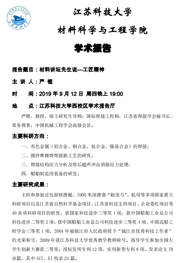 讲座预告|材料讲坛先生说--工匠精神(报告人:严铿 2019年9月12日)
