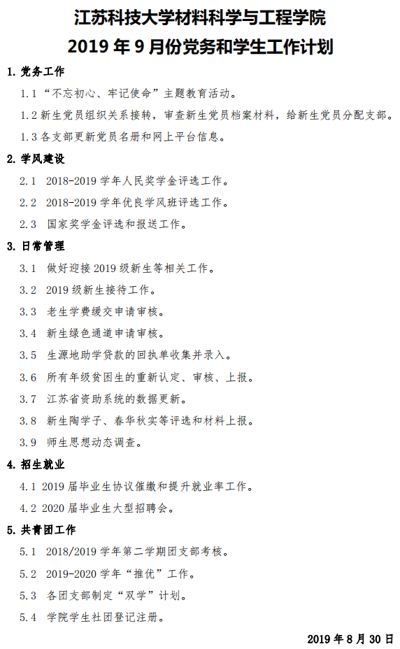 工作计划|2019年9月 党建、员工工作计划