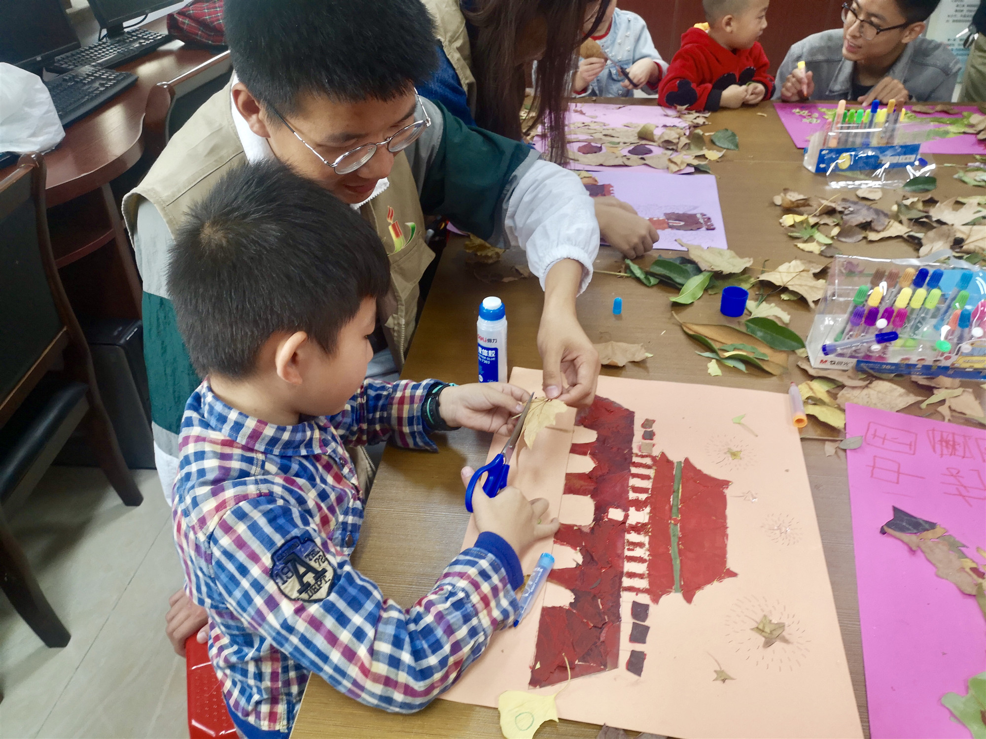 活动开始,小朋友和志愿者们齐齐入场,活动室的桌子上摆满了志愿者们压平处理过的树叶。小朋友们挑选心仪的树叶用安全剪刀剪出自己需要的图案,在志愿者们的耐心指导和辅助下,将剪好的树叶用胶水贴在图纸上。志愿者一边辅助小朋友完成作品,一边向小朋友介绍画里的中国建筑和中国科技产品。最终小朋友和志愿者们共同合作,将一片片小小的落叶通过剪裁、粘贴,用了近一个小时,完成了《万里长城》、《天安门》、《蛟龙号》等十幅献礼作品。活动结束后,小朋友和志愿者与创作的画作合影留念。