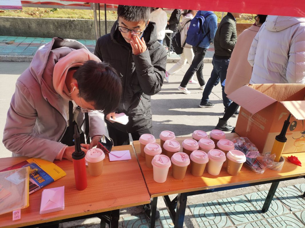 此次活动主要分为微笑气球、温情奶茶两个部分。同学们将自己对其他人的祝福写在纸条上放进气球里,再从展架上选一个气球扎破获得别人的温暖祝福。活动第二部分,同学们将自己想说的话和祝福写在贺卡上,再抽一张其他人写好的贺卡即可获得一杯温情奶茶。通过陌生人之间的祝福纸条与奶茶互递,让更多的互相认识,增进友谊。