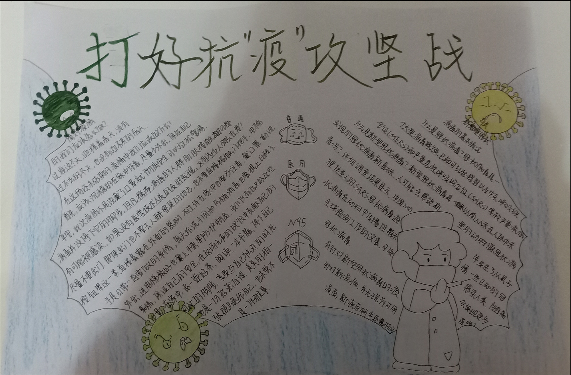 活动最后,班长针对此次活动主题发布了调查问卷,了解同学们对疫情和活动的内心想法。同学们纷纷表示要用自己的实际行动来为那些在疫情中无私奉献的人们致敬,向他们学习,展现出老员工的历史使命与社会担当。班上两位同学分别制作了一份手抄报和一份漫画,用他们的笔描绘了对医护人员的感谢和对中国抗击疫情的加油。“少年强则中国强”,此次抗疫战争与我们每个人息息相关,这更是我们新时代老员工担当责任的时候,我们要用自己的方式为祖国分忧打好这场抗疫攻坚战。