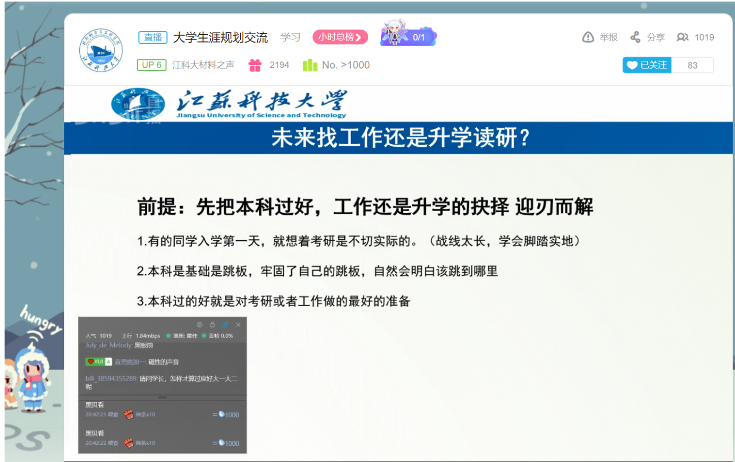 这些问题是4月5日suncitygroup太阳集团通过线上直播方式开展老员工学业和职业生涯规划交流会中,2015级金属材料专业毕业生魏天谣同学和2016级金属材料工程邢珊珊同学与学弟学妹们分享的问题。此次线上交流用时近3小时,最高在线人数达到1027人。