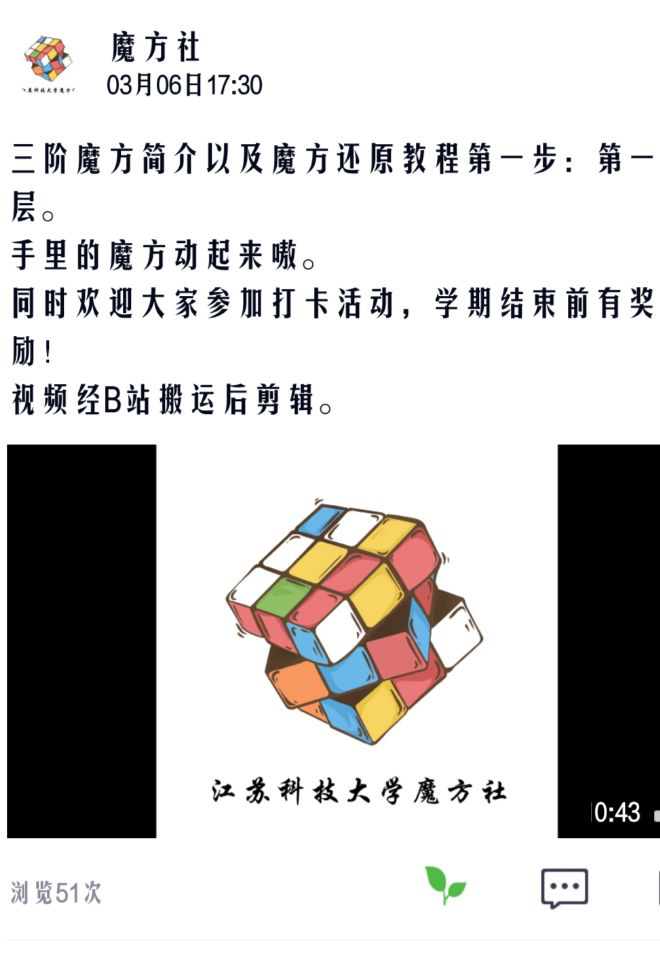 此次活动采取线上打卡的形式举办,每次打卡收集了社团成员的还原魔方视频,由公众号展示,展现了社团成员还原魔方的风采。此外,魔方协会还进行了两期线上还原魔方教学视频,激发同学们对魔方的兴趣,使更多的同学对魔方基础常识有了一个初步的认识,还原魔方的过程有利于锻炼同学们的计算能力、应变能力。通过这次活动,同学们在上网课之余,放下手机和电脑,将不能出门的时间投入到自己的兴趣爱好中。所谓“日拱一卒无有尽,功不唐捐终入海”虽然每天只前进一小步,但只要坚持,时间久了一定会走到自己想走到的地方。
