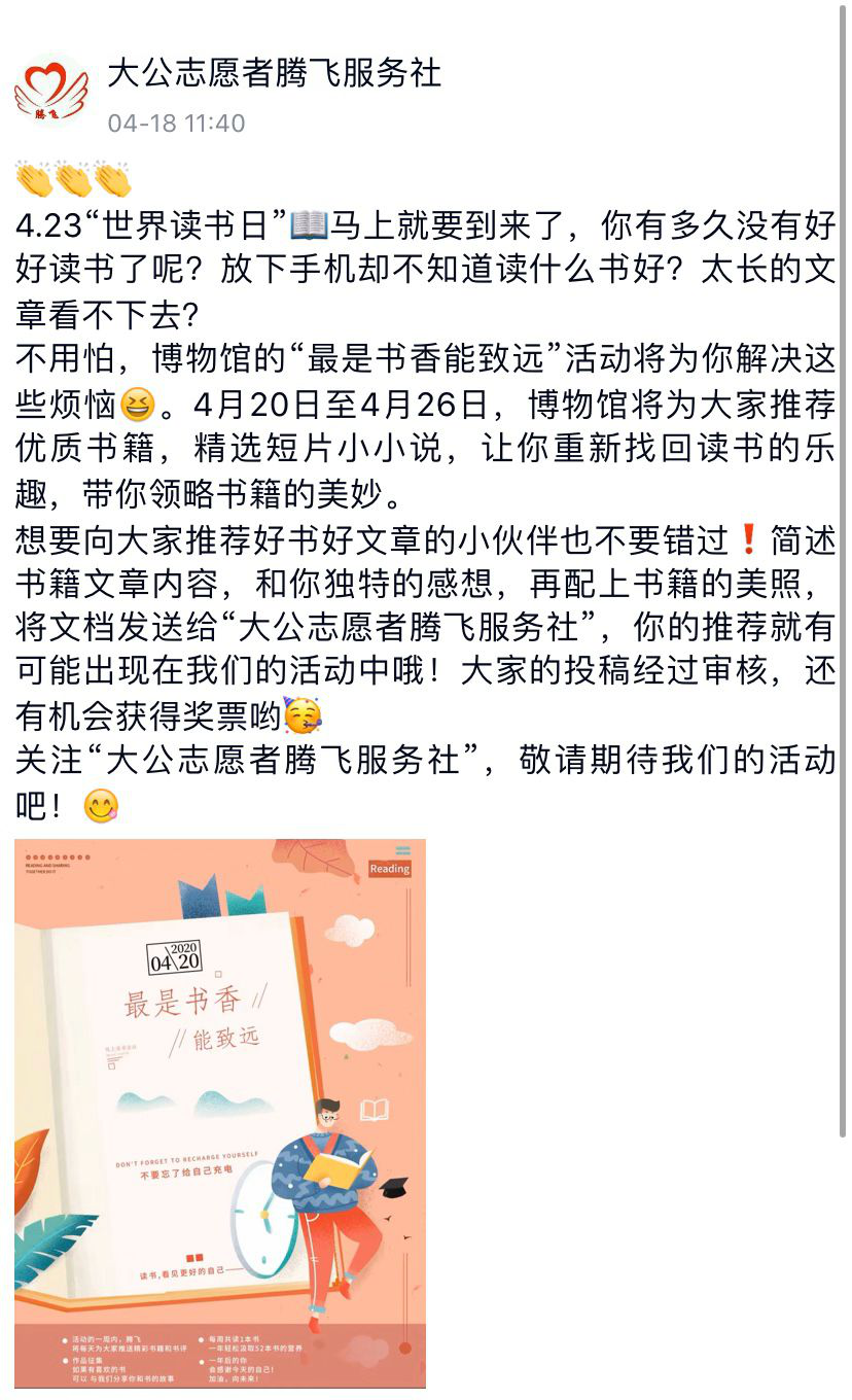 活动过程中,同学们将收集到的读书分享进行汇总,从大家的投稿中精心挑选文章书籍,配上精美的图片和独特的感想,每日在腾飞公众号上发布一篇读书分享活动说说,让同学们学完网课感到疲惫后放松一下心灵,享受视觉和思想的盛宴。