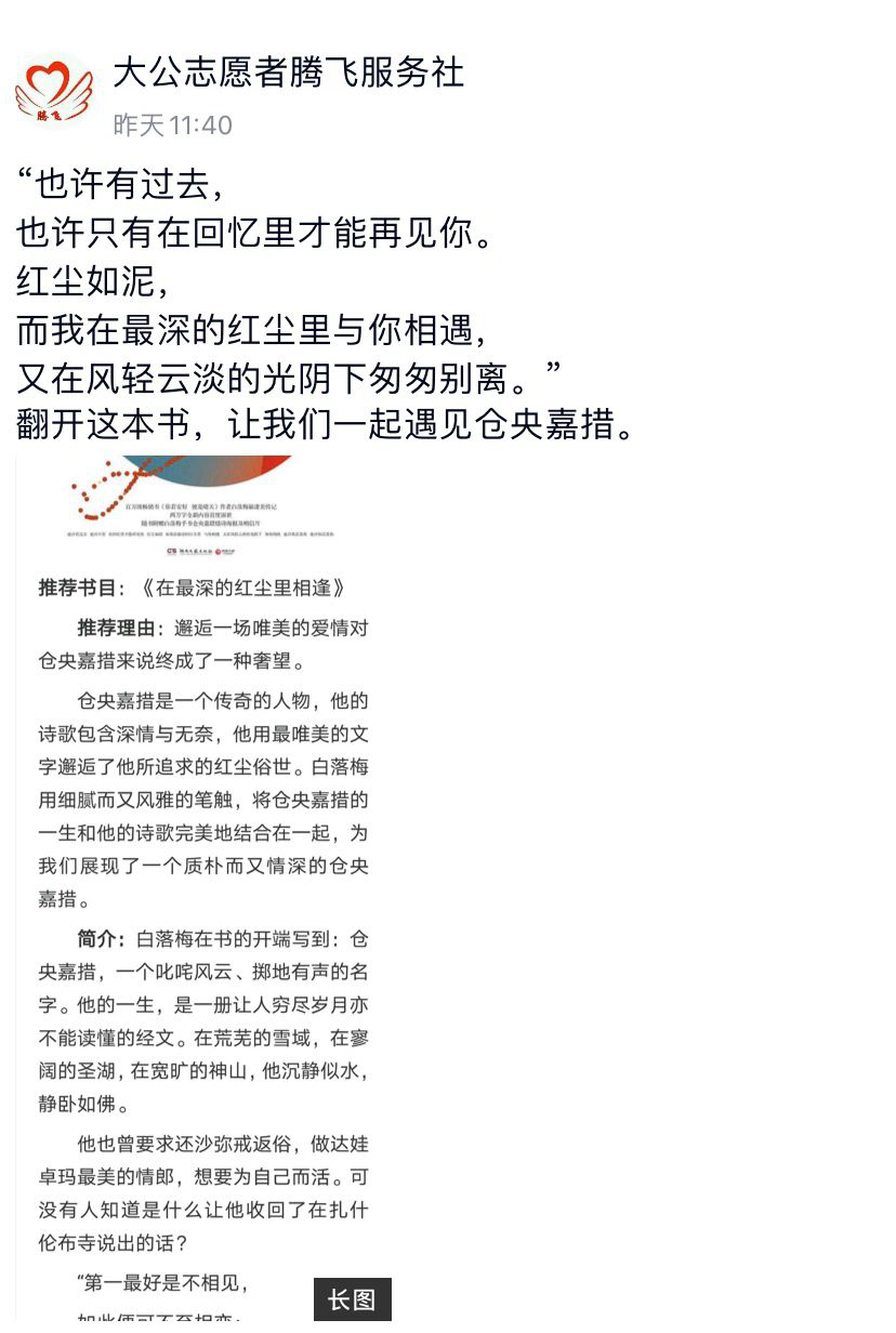这次读书活动的推荐范围极为宽广,题材丰富,有《活着》带我们体悟艰苦生活磨不去的不屈,福贵带着沧桑和平静一路向我们走来;有《撒哈拉的故事》为我们讲述沙漠里的别样风情,奇女子三毛在苍茫而神秘的沙漠里大笑;有《在最深的红尘里相逢》则让我们了解雪域高原一代活佛仓央嘉措的传奇人生,住进布达拉宫,他是雪域最大的王,流浪在拉萨街头,他是世间最美的情郎……当然,还有《追风筝的人》《教父》《一个叫欧维的男人》等经典名著。优质小小说《半生缘》更是亮点,把时代洪流下一对平凡夫妻的爱情娓娓道来,腾飞项目组希望用小篇幅的文章重新唤起大家对阅读的热爱。