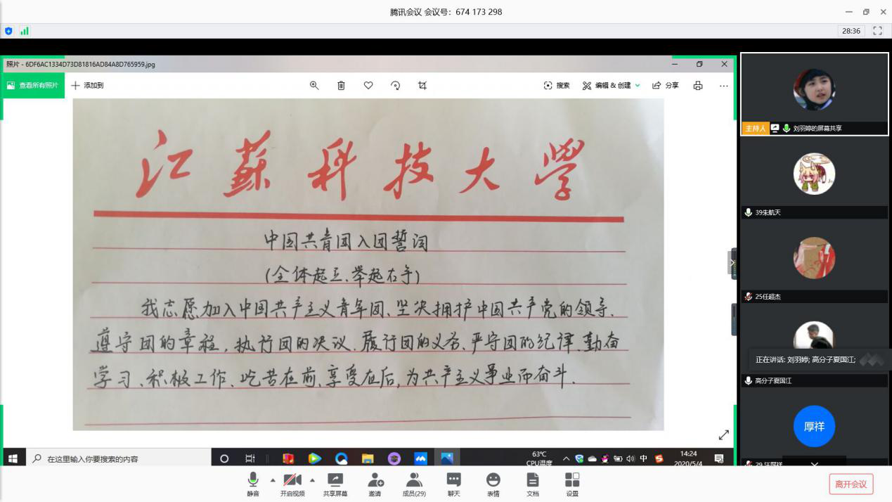 本次团日活动以学习新华网视频为开头,视频展示了疫情发生之后我国采取的一系列有效措施。看完视频后,团支书和同学们探讨了包括和疫情以及国家制度相关话题,首先是“中国为什么能取得疫情防控阻击战的阶段性胜利”,中国能打赢这场战争,是因为中国共产党从创办开始就坚持马克思主义唯物史观,坚持人民是历史的创造者,群众是真正的英雄。其次是“时代赋予了当代青年人怎样的历史使命”,告诉同学们要有“方今天下,舍我其谁”的豪气,要有勇于担当、敢于拼搏的奋斗精神。最后是“面对时代大任,我们应该怎样做”,告诉同学们应该要树立信仰用信仰为青春定向,用知识为青春赋能。随后,团支书组织同学们宣读中国共青团入团誓词。团日活动结尾之际,大家还通过抢答的形式进行了青年大学习知识竞赛,十六道题目全部出自青年大学习中,同学们积极参与讨论,抢答题目,对其他同学错误的回答还进行纠正和解释。同学之间的讨论使得大家对题目的理解更加深刻。