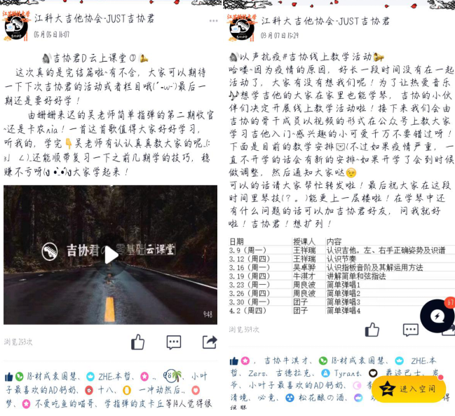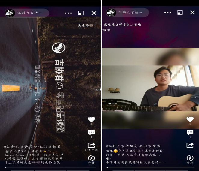 此次活动历时三个月,所有课程内容均为吉他协会内部成员录制、剪辑,最后再由吉协官方账号“JUST吉协君”进行持续的推送,为同学们带来高质量的吉他课程,并且得到了大量同学的关注与学习。本次“吉协君的云上课堂”线上吉他教学活动将吉协最具传统特色的活动教学延续下来,并且借助互联网与视频剪辑技术得到了更多元化的呈现。比如将流行文化、二次元文化融入教学,使课堂更加活泼生动,给了员工继续学习的动力。