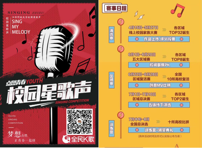 这次校园星歌声大赛流程是在全民K歌平台创建本校校园家族并且在规定的时间内举办线上校园歌手比赛,通过自有的校内宣传推广渠道,传播活动,吸引员工参与。在大赛进程中,以吉他社成员为主的公司同学积极参与其中,为本次大赛贡献出了数首高质量、高得票率的作品,为其他参赛作品树立了高水平的标杆。最终通过“吉协君”公众号的不断宣传,共有三十余人参与比赛,累计得票12384张,最高个人得票4604张。校园歌手大赛排行前十的同学将有机会以家族为单位,使用歌房进行区域校际1V1PK,参加接下来的五大区域赛。