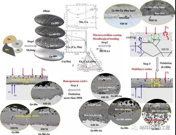 运用高能微弧合金化技术,制备了多类微晶尖晶石型氧化物涂层,并进行了对比研究。研究表明:经750℃长时间氧化后,Cu-Mn涂层仍具有较低的接触电阻值。Cu掺杂的Co-Mn涂层可以有效抑制Fe、Cr元素的外扩散。长时间氧化后Cu掺杂的Co-Mn超细晶涂层的面比电阻值略低于Cu-Mn涂层,展现了良好的综合性能。该研究成果近日在线发表在Corrosion Science(DOI: 10.1016/j.corsci.2020.108738)
