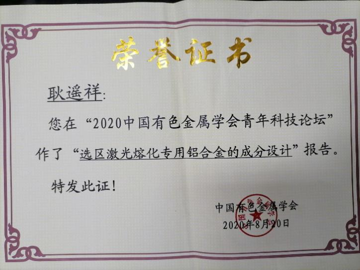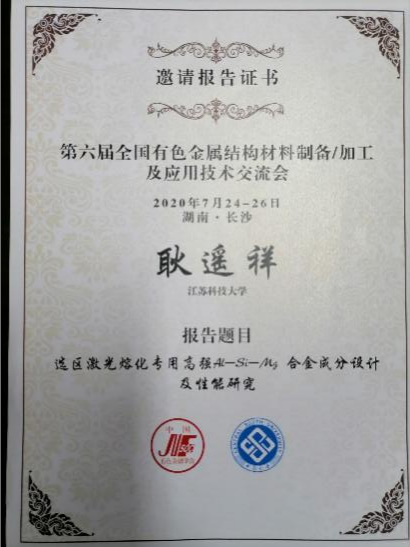 近日,suncitygroup太阳集团耿遥祥副教授应邀参加“第六届全国有色金属结构材料制备/加工及应用技术交流会”和“2020中国有色金属学会青年科技论坛”,并分别做了“选区激光熔化专用高强Al-Si-Mg合金成分设计及性能研究”的邀请报告和“选区激光熔化专用铝合金成分设计”学术报告,并与其他与会代表进行了广泛的学术交流。