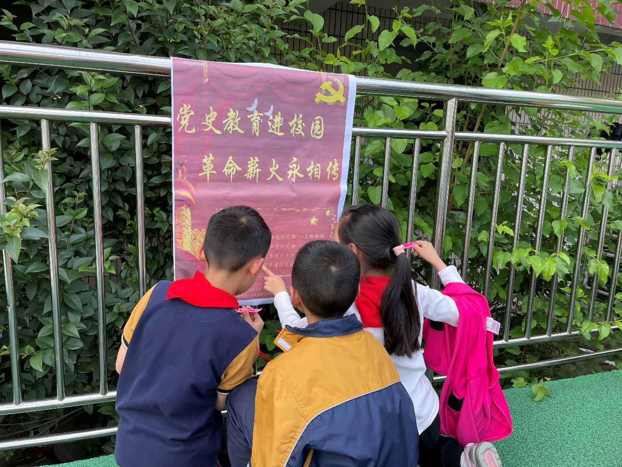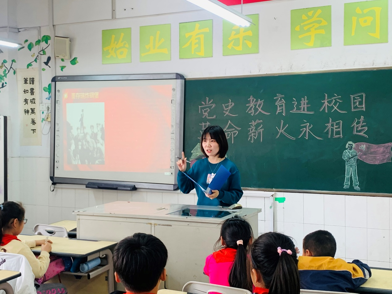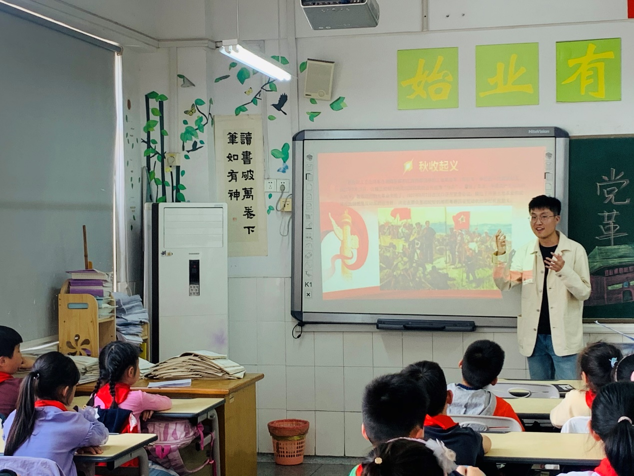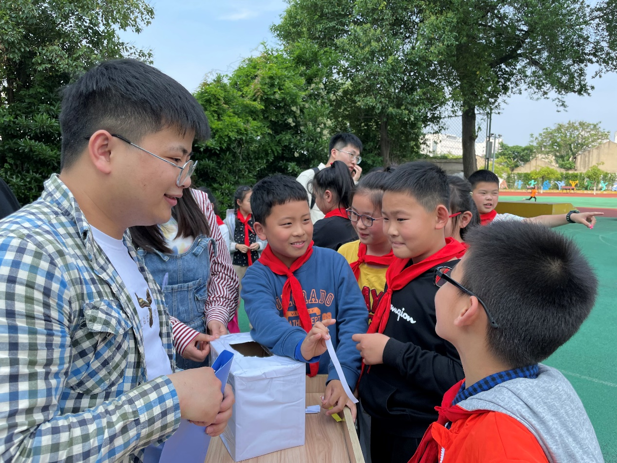 为本次活动,江科大同学们同实小老师进行了充分准备,力争办出一场深入人心的活动,在孩子们的心里埋下红色的种子。活动主要分为室内宣讲和室外趣味答题两部分,两相结合,让孩子们真正爱上学习,体会历史。在室内环节,来自江科大的三位同学第一次体验站上讲台成为课堂老师的感觉,难免有些紧张,但面对小朋友们认真的神情,端坐的身姿,老师们的热情被纷纷唤起。他们分别向小同学们讲述了红军长征、九一八事变、平型关大捷、秋收起 义、五四运动以及董存瑞等我党的重要事件和英雄人物事迹,用易懂的语言传递红色精神,虽然宣讲时间有限,但其中,红色精神深已深烙在每个小员工的脑海里,小同学们争先恐后高举的双手就是最好证明。为进一步加深印象,培养兴趣,增强团队意识,特地在室外设置了了趣味答题环节,在该环节中,根据在室内讲述的六个事迹分成了三个答题摊位,小员工们四人一组,协作完成一项运动后,有序从相应的党史故事的问题箱里抽取问答纸条并现场作答,以累计加分形式获得最后的奖品。小同学们的热情被瞬间点燃,一时热闹非凡,同学们争先恐后,闯关答题。他们用热血挥洒汗水又感受知识,先辈们的革命道路不正是如此一般。孩子们的热情感染了在场的每一位人,这些来自江科大的研究生们同样从孩子们身上收获了感动,这是对传承的感动,更是对未来的满怀期待。