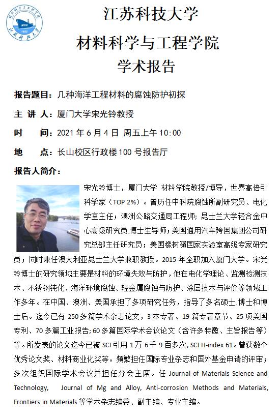 讲座预告|几种海洋工程材料的腐蚀防护初探
