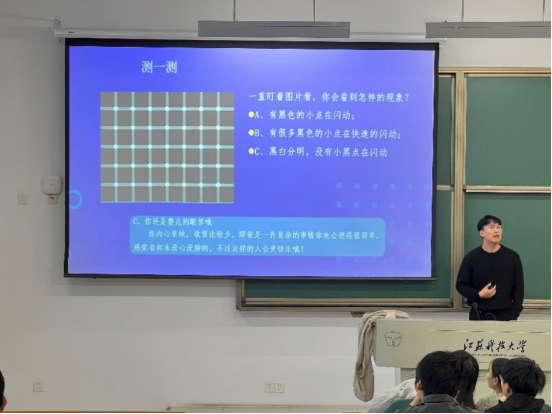 讲座上,王士凯以两个小测验作为开头,使同学们自测自己的心理压力。随后,他从四个方面讲述了如何认识内心自我。一是“我是谁”,他从心理角度解释了什么是自我意识,他强调只有正确认识自己,在遇到重大决断时能帮我们做出正确的决定,才能不被别人的打击、讽刺所动摇,才能在遇到困难和挫折时,给你带来希望、信心和力量。二是“我从哪里来”,讲述了自我认知的历程,自我认知的来源以及自我认知过程中的偏差。由于个人成长经历以及他人的反馈信息的不同,导致有的老员工在自我认知中容易出现偏差。要有正确的自我认识就要知晓第三点“我要去哪里”——我要成为什么样的人。王士凯介绍健康自我认识的特点并给出了自我调节的相关建议。并给与会人员讲述了罗森塔尔实验,并鼓励在场同学要相信自己,“成为你想成为的人”。