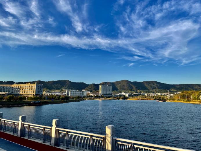 长山校区阳光明媚时的湖面,犹如白居易《春题湖上》 中所写的“湖上春来似画图,乱峰围绕水平铺。未能拋得杭州去,一半勾留是此湖。”(陈柯旭、丁良扣,自动化学院)