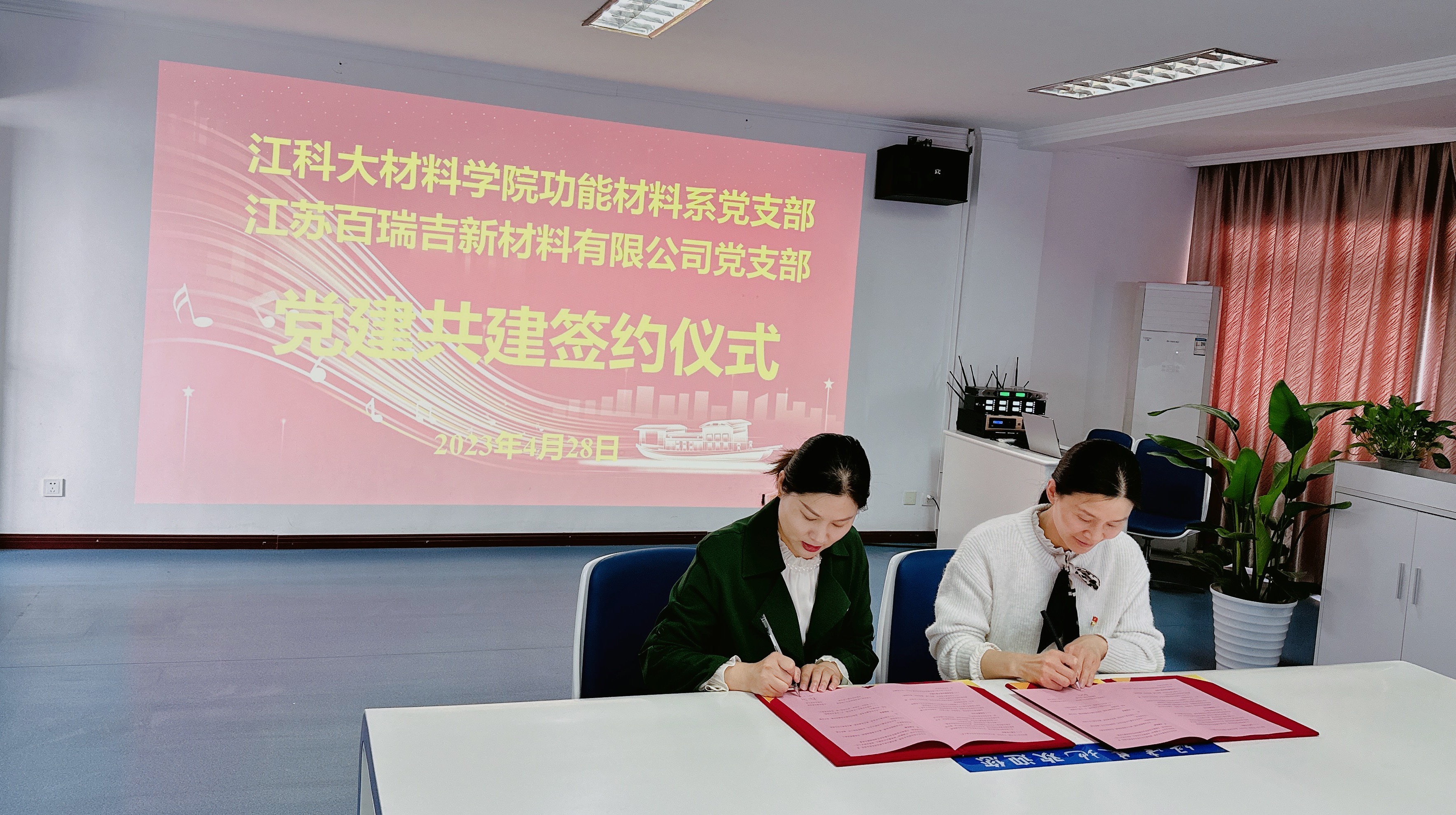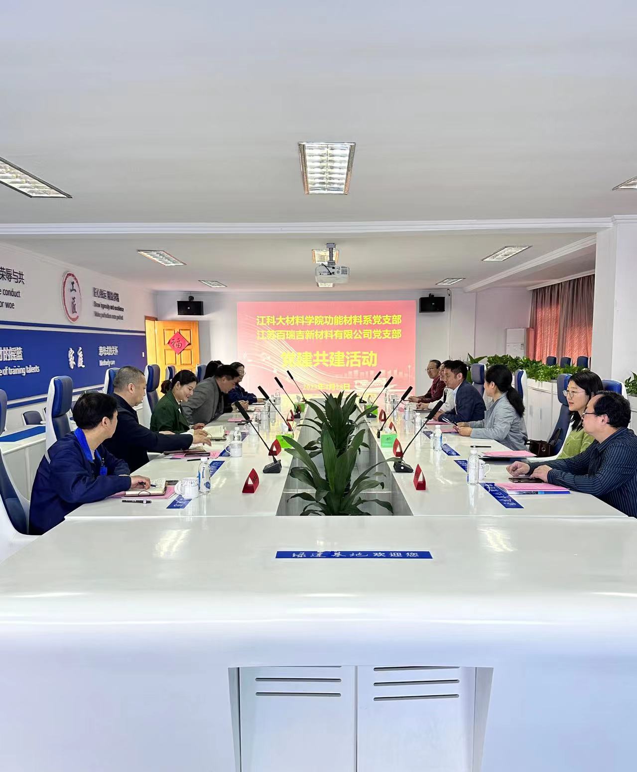 4月28日下午,公司党委书记李瑞峰、党委副书记杨海涛、功能材料系教工党支部书记袁妍妍与功能材料教师赴江苏百瑞吉新材料有限公司开展党建共建协议签约,访企拓岗促就业专题活动。