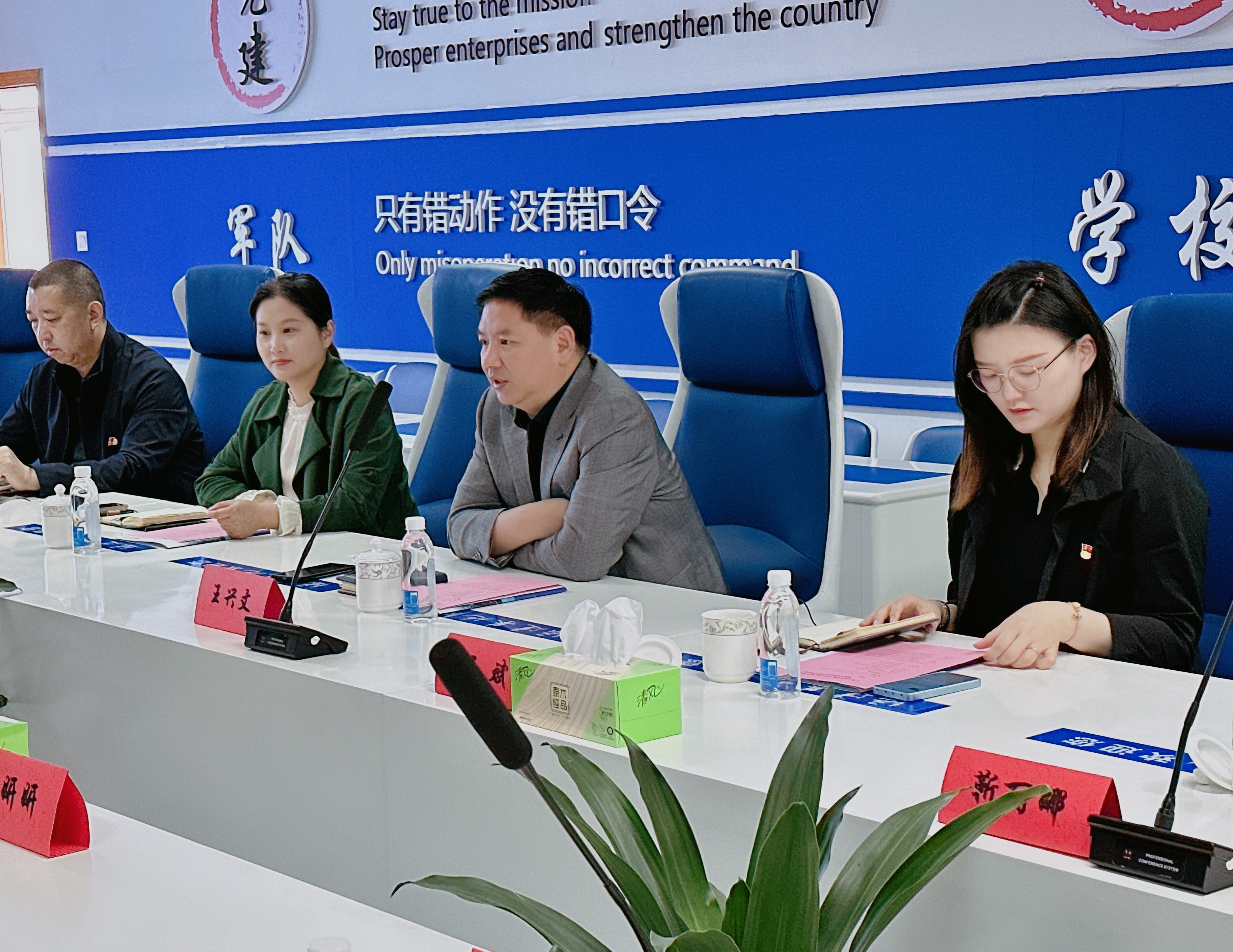 公司党委副书记杨海涛介绍了学院办学历史、团队力量、团队建设以及人才培养等方面的情况。公司党委书记李瑞峰介绍了学院在党的建设、产教融合、对外交流等方面的做法,认为双方可以在党建共建、人才培养、校企协同育人、员工就业等方面探讨交流并进行深度合作,指出了学校和企业具有的共同服务国防的特色,强调把党建红和科技蓝做实做深,希望以党建工作为引领,共建科研平台,促进校企高质量发展。