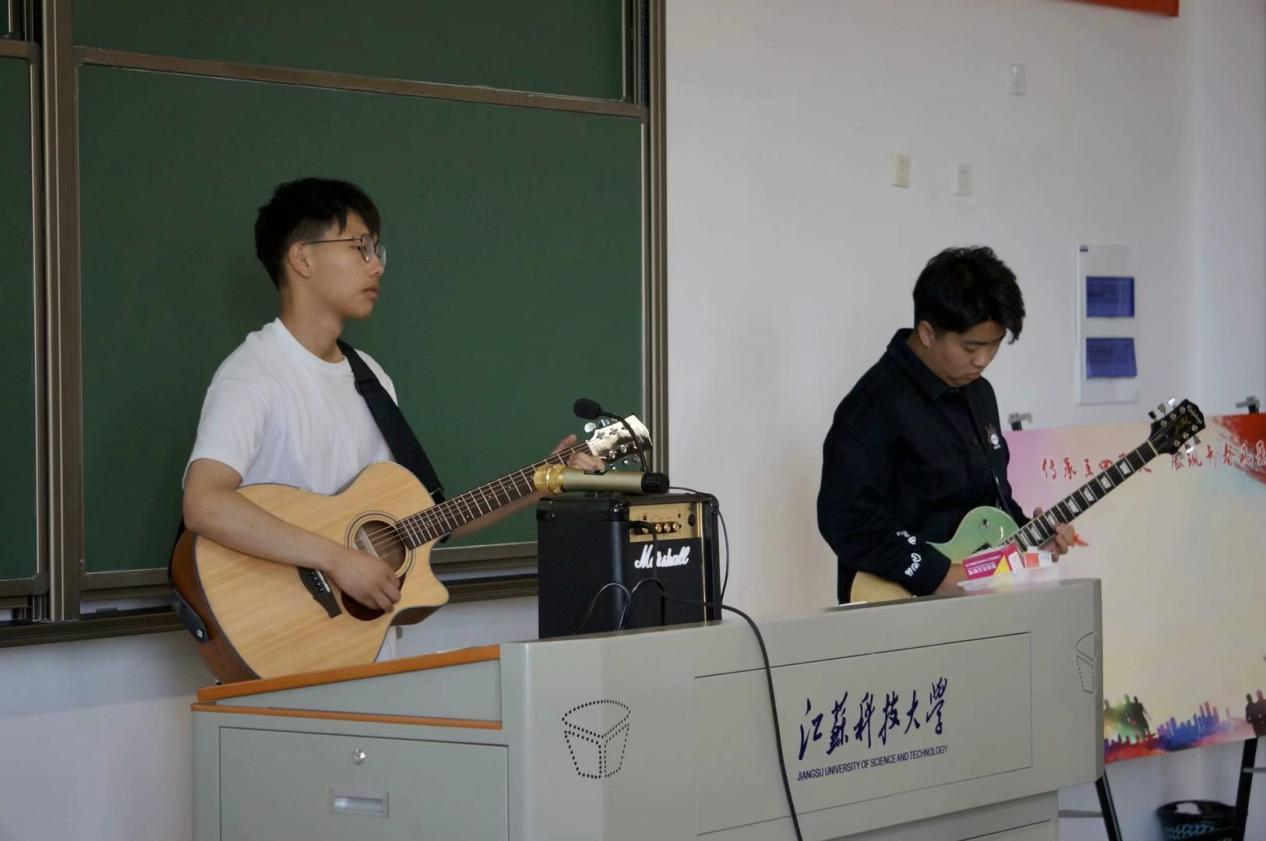 第二个环节是绘画涂鸦环节。同学们以绘画的形式抒发自己的爱国之情。绘画环节中,第五小组的同学进行才艺表演,将自己的青春热血溶于歌曲之中,将现场的气氛带向高潮。