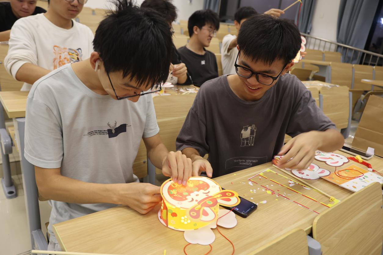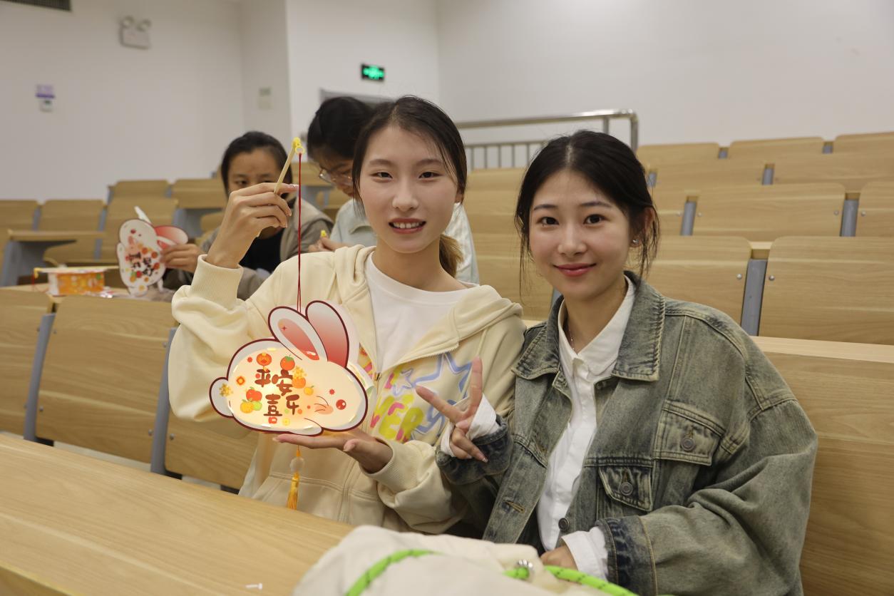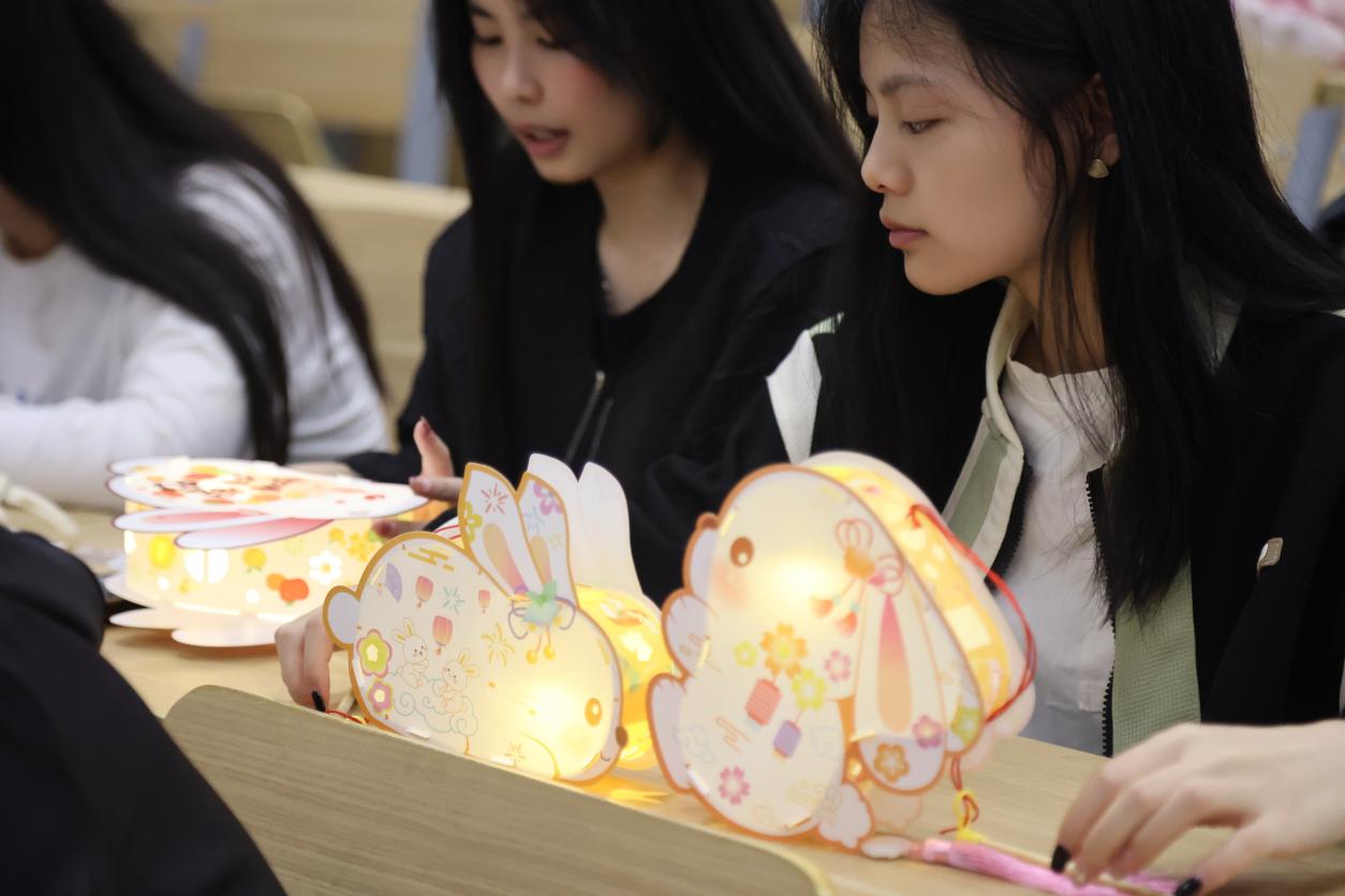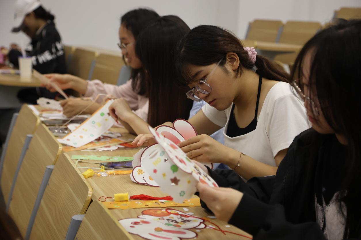 随后,同学们在活动负责人的引领下,有序选择自己喜欢的灯笼样式并领取制作工具,开始动手制作。同学们根据兔子灯的组装步骤,两人一组默契地展开了制作。从零部件的组装到造型的拼接,再到提线的粘合。很快,一个个精致的兔子灯呈现在了大家的眼前。