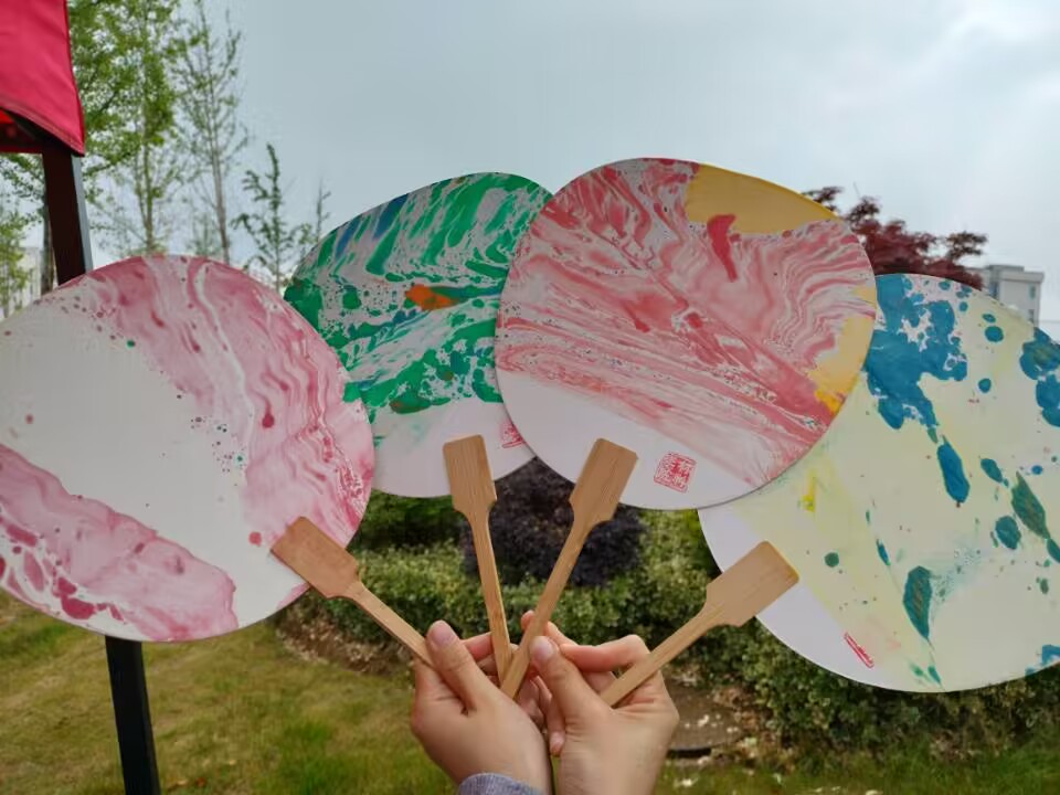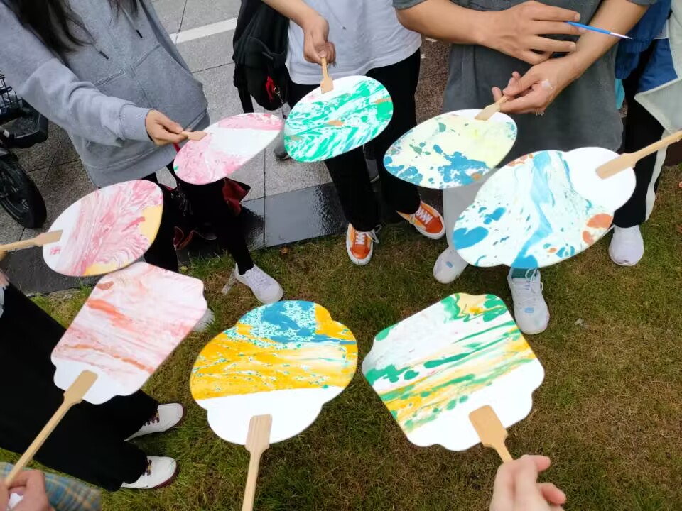 活动现场陈列着五彩斑斓的漆扇DIY材料,包括空白扇子、各色漆料、油画颜料等,琳琅满目的道具吸引了众多员工驻足参与。同学们在色彩斑斓的材料中挑选自己喜欢的颜色和工具,兴奋地开始了他们的创作之旅。空白扇子宛如一张张洁白的画布,等待着被赋予新的生命和故事。同学们小心翼翼地将油漆缓缓倒入水中,调配出绚丽的色彩,然后将扇面浸入水中,漆料在水面上自由流动,形成了独特的花纹。大家全神贯注地进行着创作,现场欢声笑语不断,气氛热烈,每一个角落都洋溢着青春的活力与创意的激情。