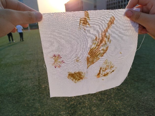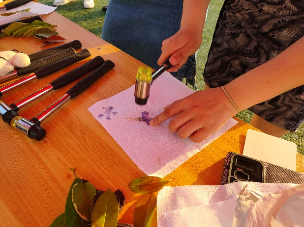 参与植物拓染的同学们收集了多种各色的花草落叶,将它们沾湿后放在拓染布下,用小锤轻轻的敲击。植物的汁液浸入织物之中,洁白的布上慢慢浮现出草叶的脉络和花瓣的颜色。落花无情人却有情,同学们通过拓染将夏日花草的繁盛留存于素娟之中。