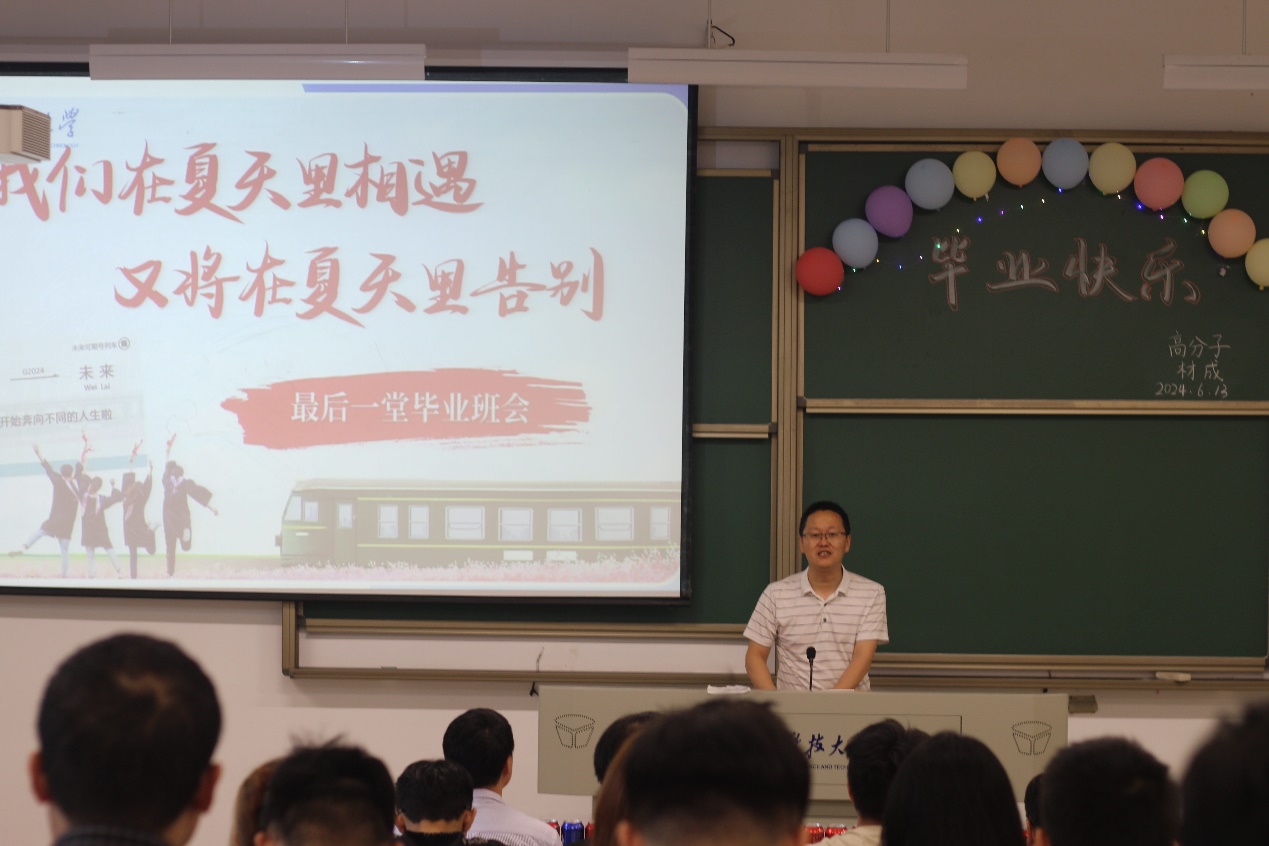 担忧,始终保持积极向上的心态,将“船魂”精神传递下去。下午,高分子、材料成型主题班会在笃学楼101教室举行,suncitygroup太阳集团经理晏超,高分子系周海骏、施敏杰,材料成型系乔磊参加活动。晏经理深情回顾了自己作为学业导师和同学们朝夕相处的点点滴滴,真诚祝福2024届毕业生顺利毕业,前程似锦。6月6日,金属材料系主任陈洪美、功能材料系主任袁妍妍、材料成型系副主任臧千昊,以及学业导师张兴华、李洁老师共同参加三个专业的主题班会,为同学们送上祝福。