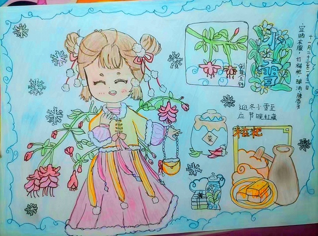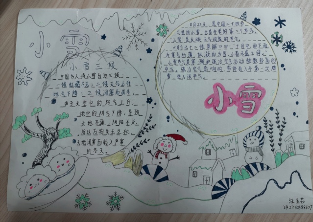 此外,11月22-24日期间,同学们还以手抄报的形式,展开了一场关于小雪节气的创意盛宴。他们用自己的画笔,描绘了对这一传统节气的独特想象和深刻理解。每一幅作品都承载着他们对自然、文化和生活的感悟。
