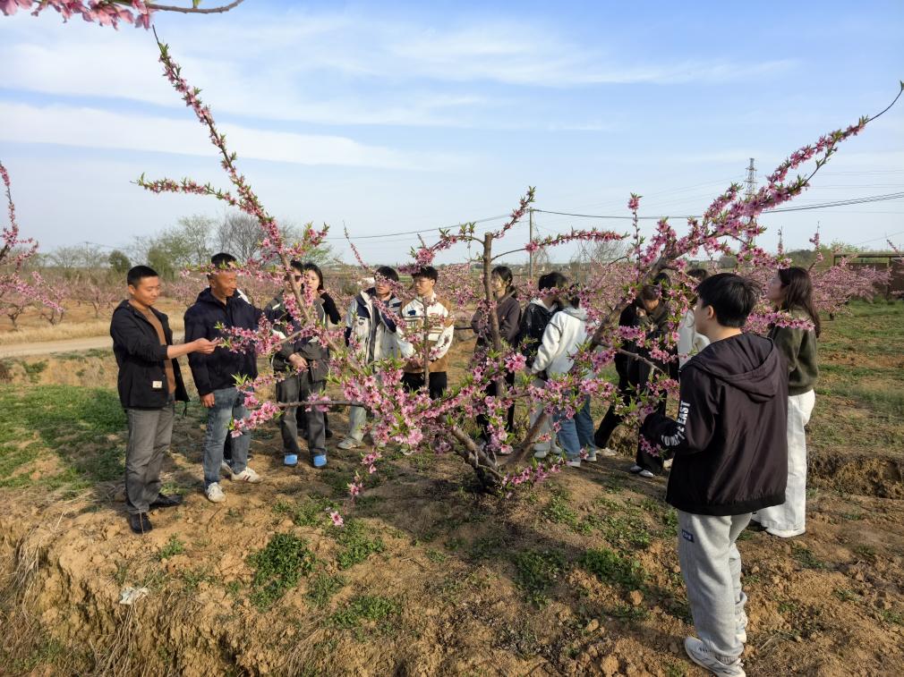 “桃花夭夭,灼灼其华”,置身于葱郁的园间,敖毅村村委书记、种桃大户和新农人们以专业且详实的语言,向同学们阐释黄桃播种育苗到抽枝散叶、绽蕾开花、结出果实的整个生长历程。同学们凝神细听,用心汲取知识,在赏鉴烂漫春光过程中丰富了自身的农学知识储备。