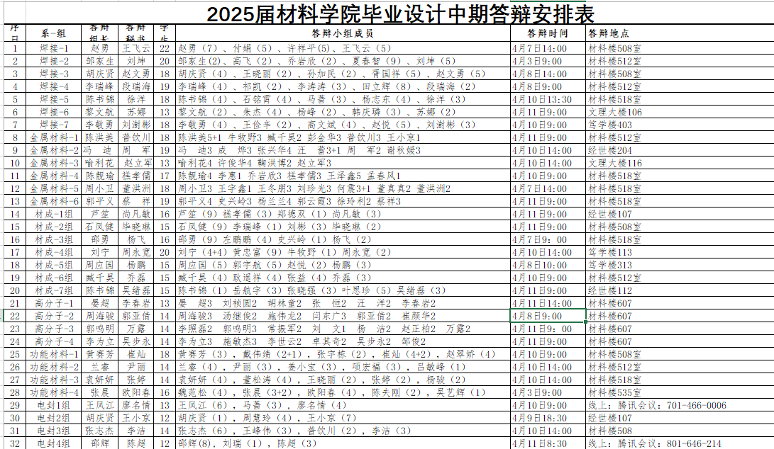 本次中期检查工作覆盖suncitygroup太阳集团2025届全体毕业生,学院成立了焊接、金属材料、高分子材料、材料成型、功能材料和电子封装6个专业共计32个检查小组,并明确答辩小组人员构成,答辩时间从4月3日持续至11日。检查前,学院制定了期中检查的评分标准,明确检查流程和要求,确保检查工作规范、有序进行。