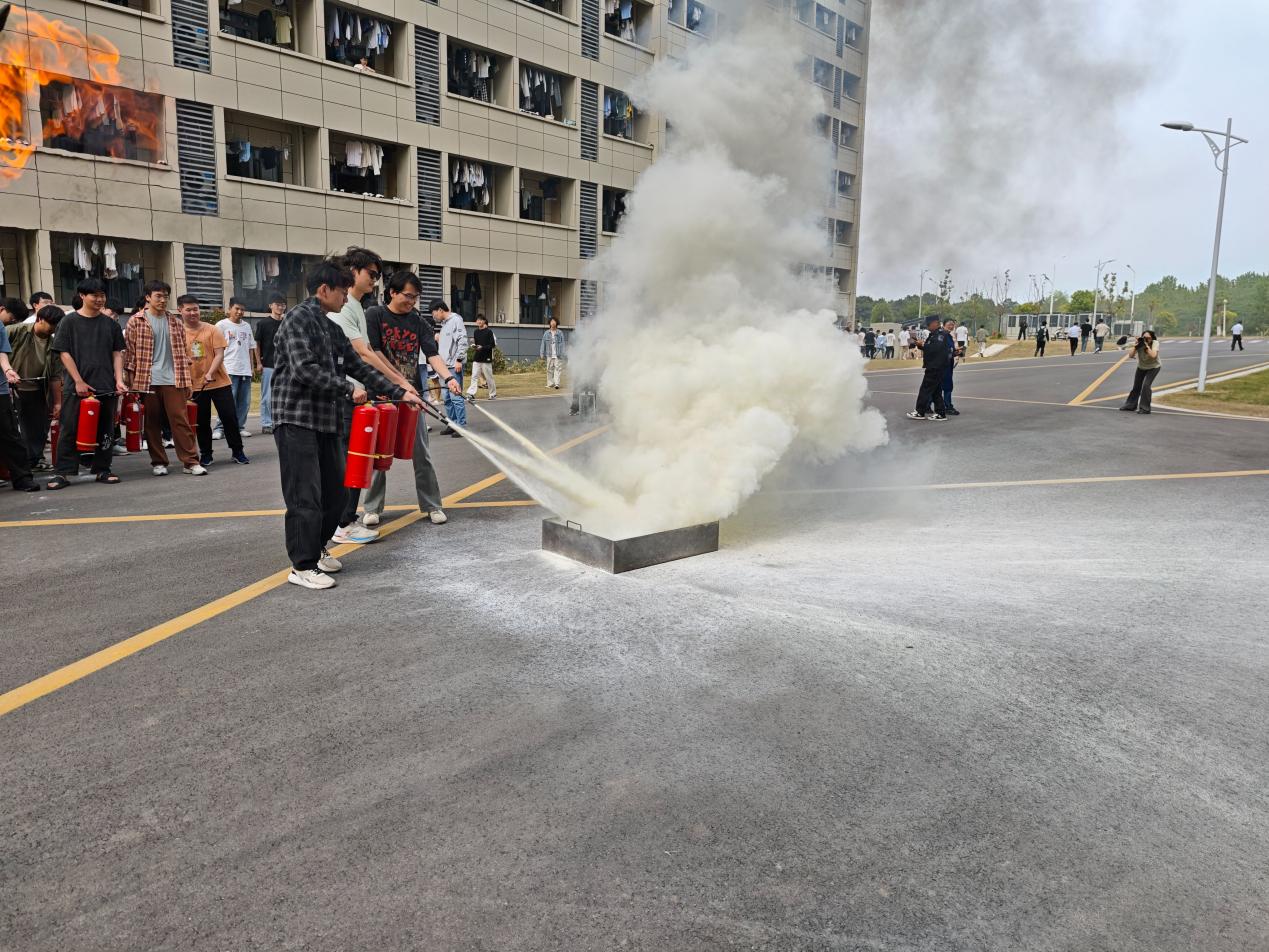 在消防器材实操环节,安保处工作人员现场演示了干粉灭火器的“提、拔、握、压”四步操作法,并指导师生代表进行灭火实操。参演师生分组练习,通过实战化训练掌握了灭火器材的正确使用方法。
