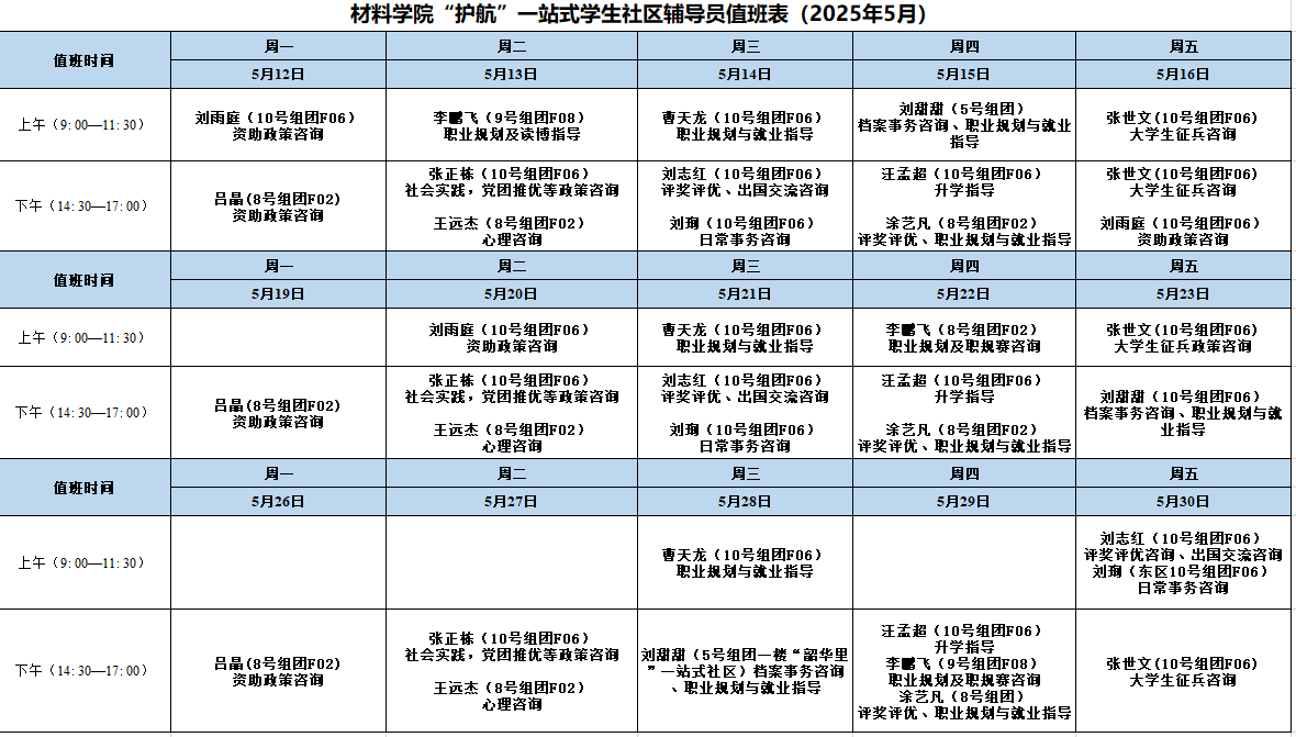 ​suncitygroup太阳集团“护航”一站式员工社区辅导员值班表(2025年5月)