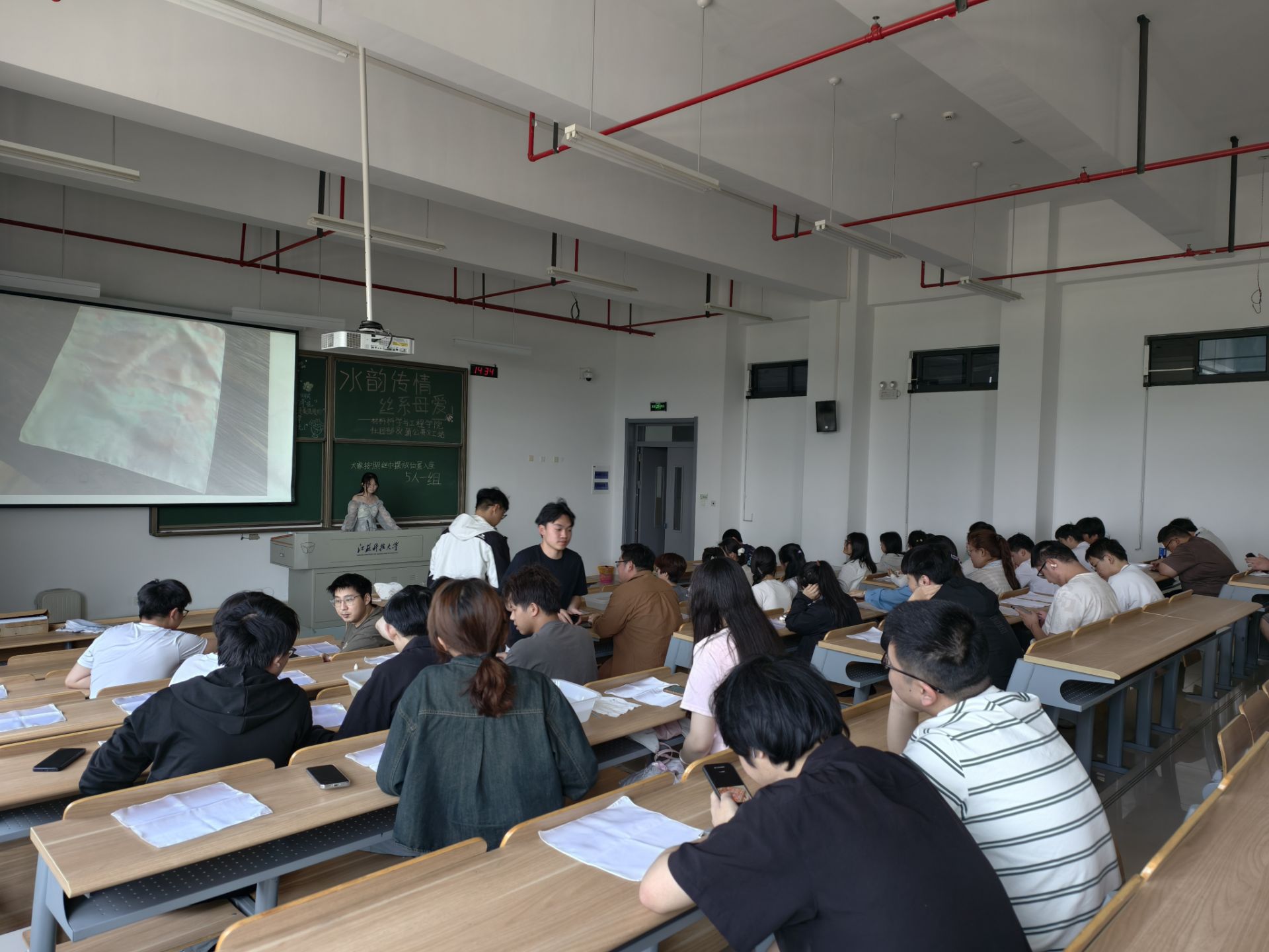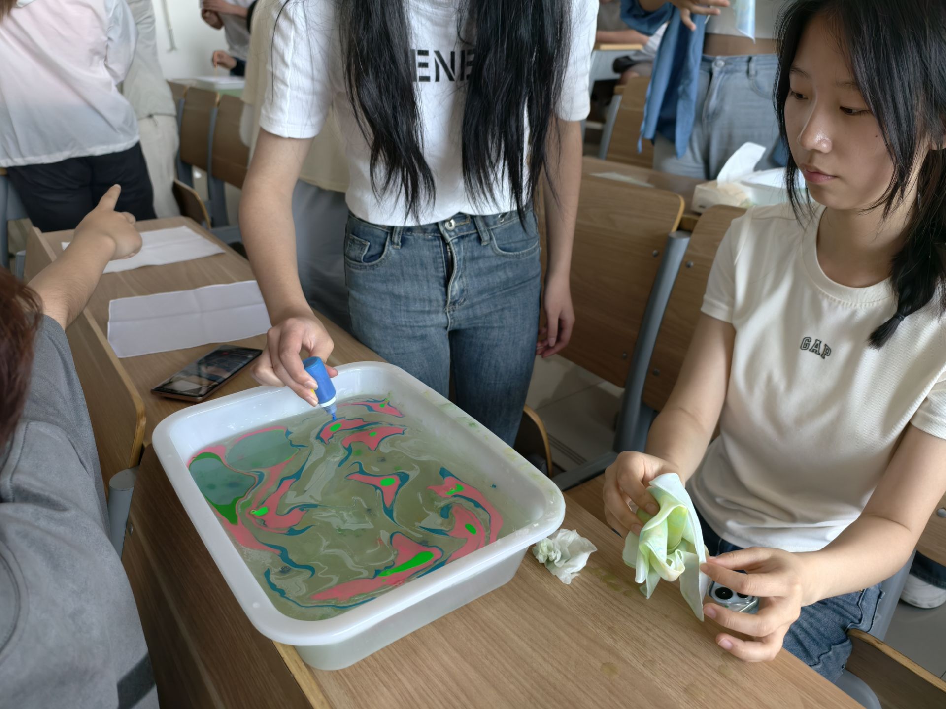 活动伊始,组织者通过图文与视频带领同学们走进水拓艺术的历史长河。水拓技艺起源于古代丝绸之路,通过在水面调配天然颜料形成流动纹路,再拓印至丝绸或纸张上,被誉为“水中的东方油画”。现场演示了颜料调配、水面构图、拓印定型等完整流程,生动展现了这一非遗技艺的精妙。蒲公英义工站的志愿者还结合材料学科特色,讲解了丝绸纤维特性与颜料附着原理,让同学们在艺术创作中感受科技与传统交融的魅力。