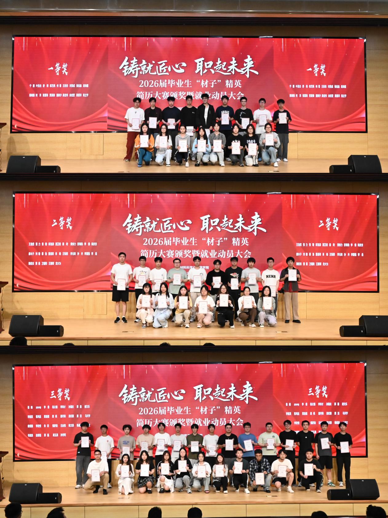 大会伊始,杨海涛副书记宣读了首届 “材子” 精英简历大赛获奖名单,并为获奖同学颁发荣誉证书。此次大赛吸引了近600名员工报名参赛,经过简历初评、互评、终评等环节,75名员工脱颖而出。获奖作品以“突出专业特色、强化实践能力、展现职业素养”为亮点,充分体现了材料学子对求职技能的扎实掌握。杨海涛在致辞中强调,简历是求职者的 “第一张名片”,希望同学们以此次比赛为契机,不断打磨求职材料,将工匠精神融入职业规划,为未来发展筑牢根基。