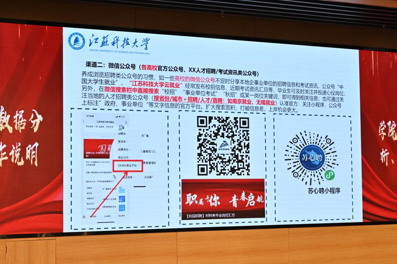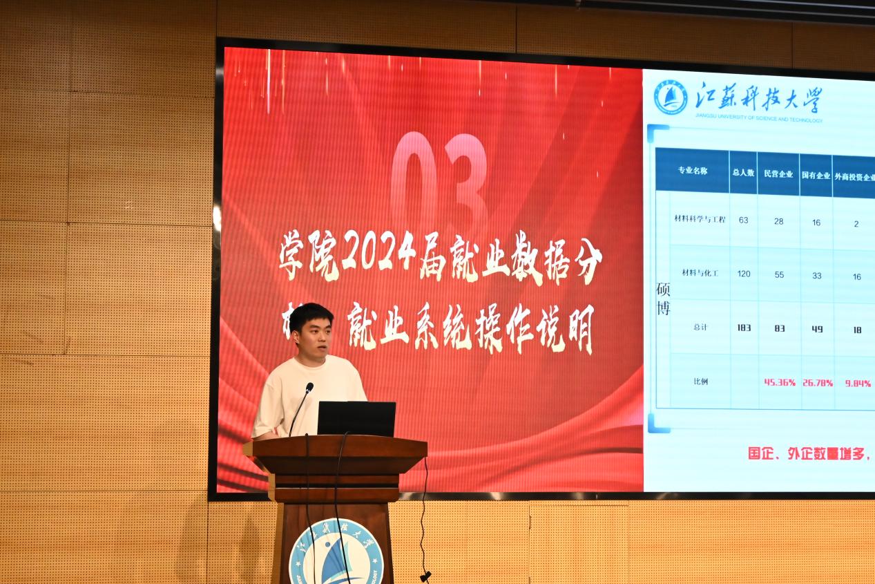 公司就业辅导员曹天龙以“学院2024 届毕业生就业数据分析”为主题,深入解读了当前就业形势及2024届毕业生各专业就业去向、用人单位质量,印证 “早规划+广渠道”的求职策略有效性。当下,集成电路、新能源等新兴产业对材料专业人才的旺盛需求,建议2026届同学把握“制造业升级”与“新材料技术突破”两大机遇。针对“考研or就业”的共性困惑,以学院近年升学数据为参照,建议毕业生问清自身需求、找准自身定位。此外,他为毕业生分享了五大求职途径及材料类用人单位,鼓励同学们主动对接优质企业资源,通过暑期实习以实践促就业,在多样化的职业探索中明确发展方向。