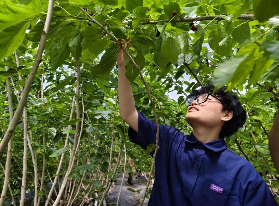 踏入蚕桑基地,支部书记王远杰向大家介绍道,学校在蚕桑研究领域具有深厚的历史积淀。经过几代人的不懈努力,目前学校已形成从基础研究到产业应用的全链条创新体系,在种质资源保护和新品种选育方面取得了显著成效。在采摘桑葚的过程中,党员同志们注意到桑树的叶形、果色各不相同,纷纷惊叹于基地丰富的桑树种质资源,也对学校在特色团队建设方面取得的成就深感自豪。