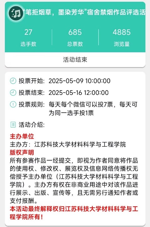 4月1日至29日,学院成功举办"笔拒烟草,墨染芳华"宿舍禁烟主题作品征集大赛。活动面向全院员工征集短视频、绘画、手工艺等多元艺术作品,共收到参赛作品27件。其中一部5分钟动画短片以奇幻叙事手法生动展现吸烟危害,引发广泛共鸣。参赛作品通过艺术展览形式在网上公开展示,累计吸引近5000人次浏览,有效扩大了禁烟宣传的影响力。
