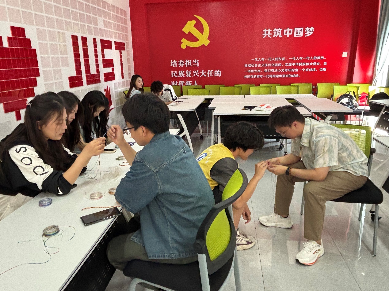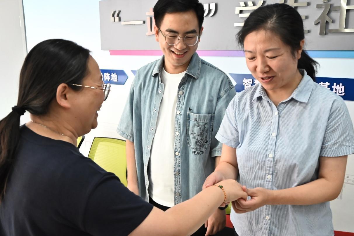 活动伊始,五彩绳编织环节率先拉开帷幕。翠绿、绛红、明黄的丝线在指尖翻飞,参与者们兴致勃勃地挑选起心仪的彩色丝线,精心编织象征平安的五彩绳。“丝线承古意,巧手纳吉祥”,杨海涛老师为宿管阿姨和同学们佩戴上五彩绳,将“长命缕”的美好寓意系于腕间。阿姨们轻抚腕上彩绳,笑言:“这彩绳不仅是装饰,更是师生情谊的纽带。”