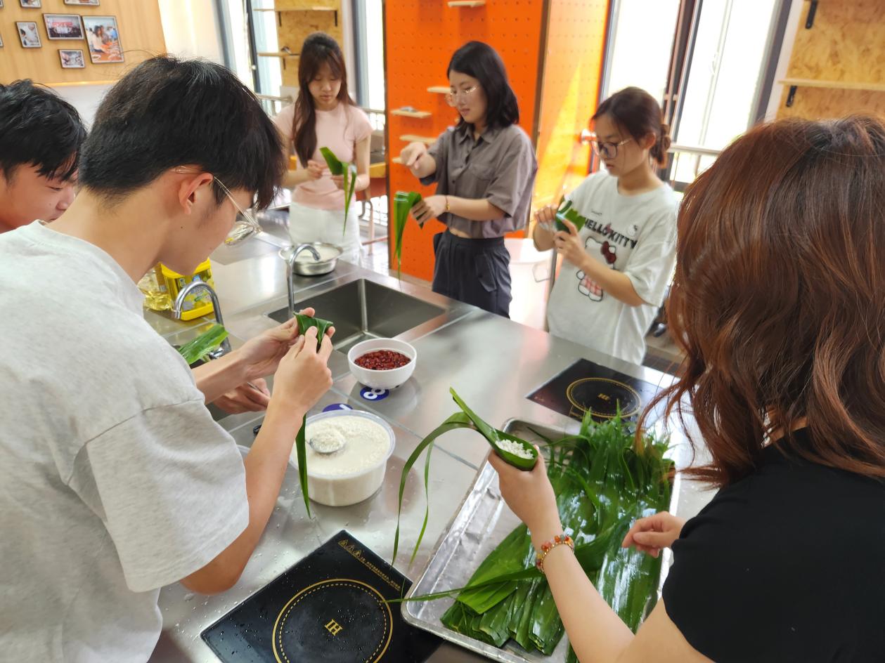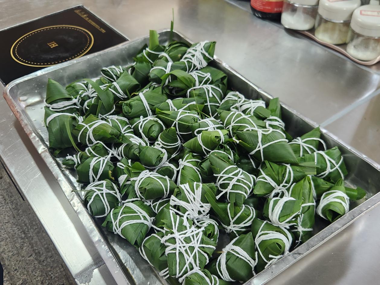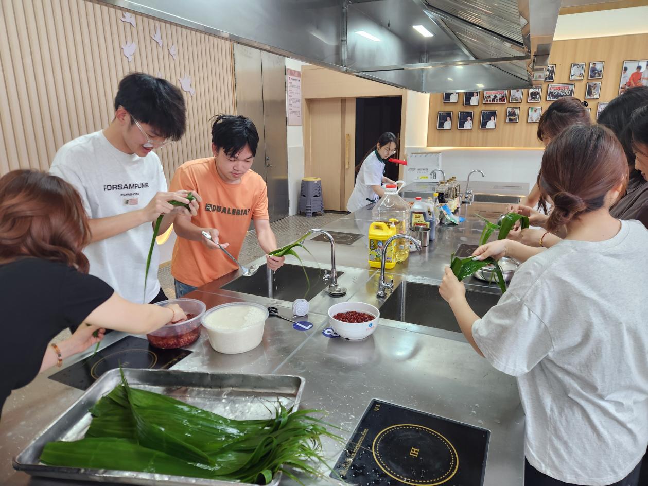 5月29日上午,义工站组织同学们前往东苑食堂。翠绿清香的粽叶、莹白如玉的糯米、饱满圆润的红豆,还有那甘甜的蜜枣,被一一整齐摆列。空气中,粽叶的草木清气与食材的甜蜜芬芳交织萦绕,沁人心脾。同学们兴致盎然,巧手翻飞,或虚心求教,或交流心得,在指尖的缠绕与叶片的包裹中,体味着传统技艺的乐趣,现场其乐融融,温情四溢。