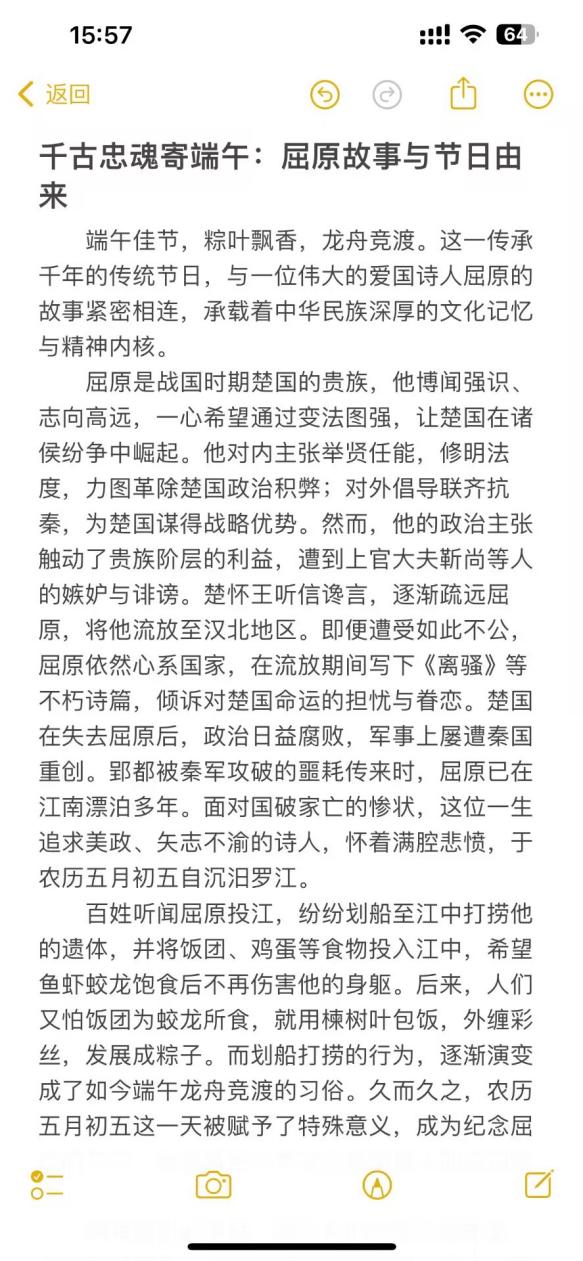 当指尖的忙碌暂歇,心绪便沉入历史的波澜。活动期间,义工站引导同学们以墨香为引,以纸笔为舟,溯流而上,重温那不朽的诗魂与节日的源头。同学们用纸笔追寻屈原“长太息以掩涕兮,哀民生之多艰”的忧国情怀,感悟他“路漫漫其修远兮,吾将上下而求索”的执着精神。在端午的节令里,那份跨越千年的爱国赤诚与理想光辉,透过纸背,依然炽热滚烫,叩击着年轻的心灵,让“端午”二字承载的“念”意,变得格外悠长而厚重。