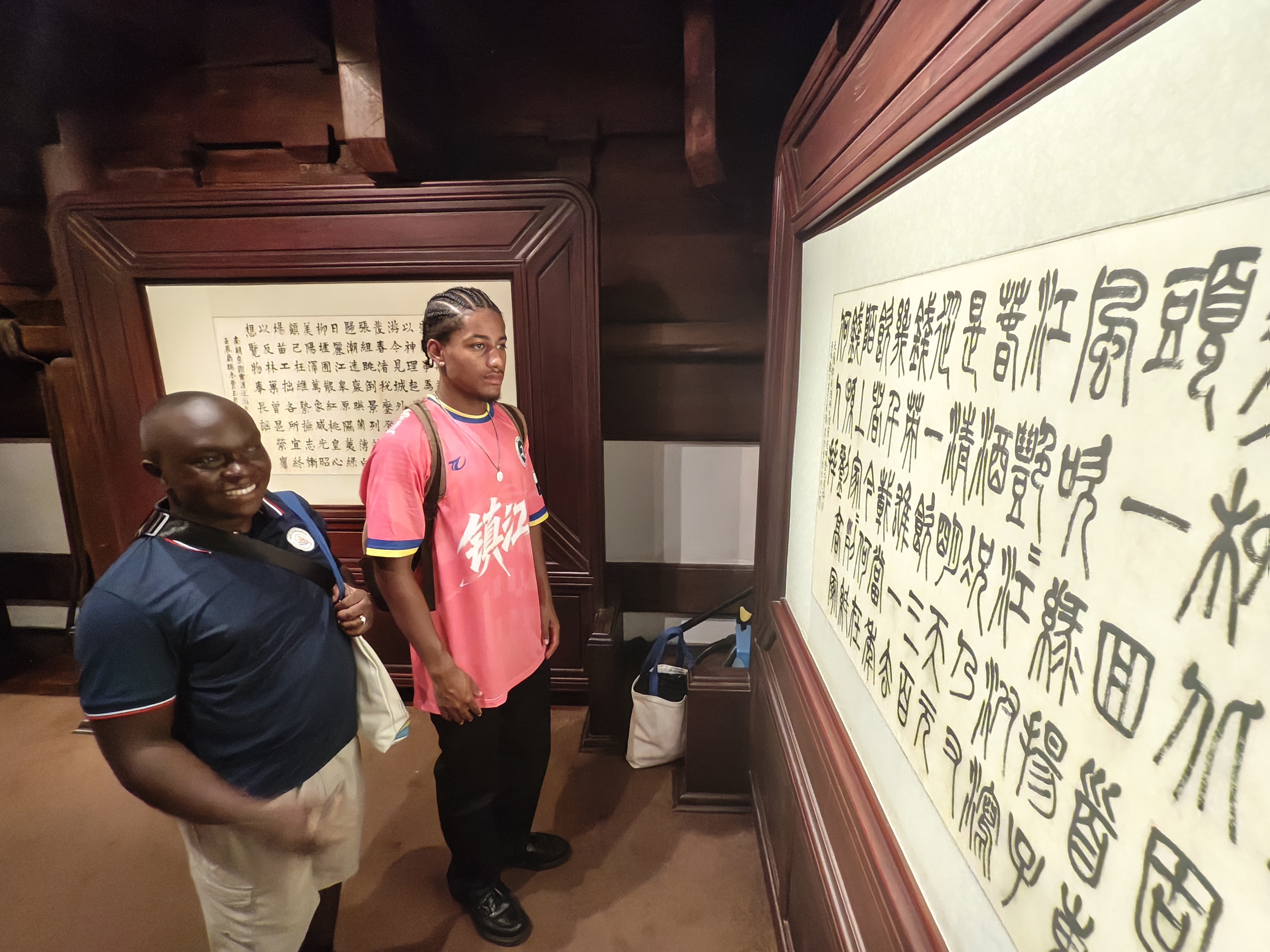活动当日,北固山的人文景致成为中外交流的生动课堂。外国学子漫步山间,在古雅建筑与摩崖石刻间穿梭,感受中国历史文化的厚重。在文化体验环节,他们对中国古文展现出浓厚兴趣,驻足于书法作品前,认真聆听讲解,尝试解读文字含义,沉浸式触摸中国传统文化脉络。