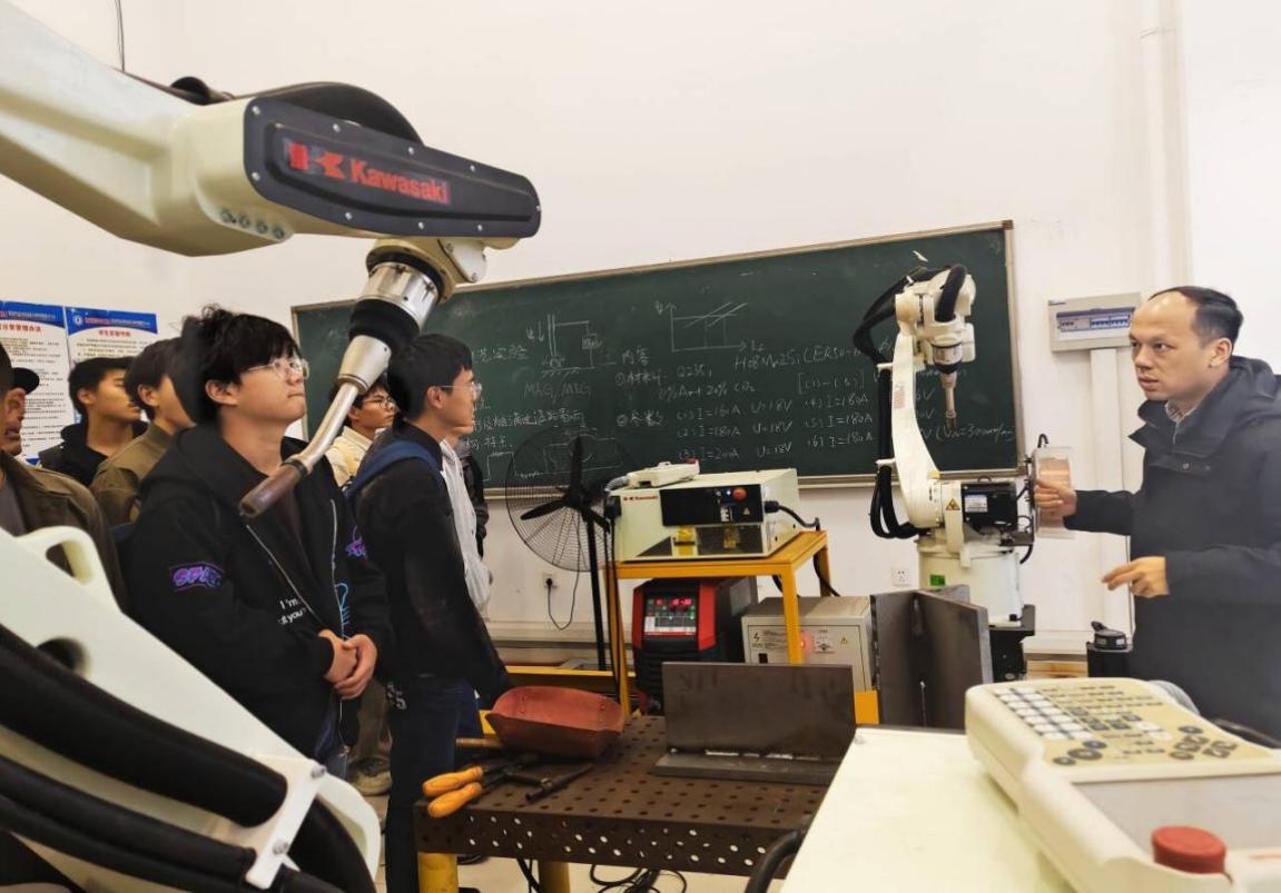 在朱杰老师的带领下,焊接专业新生有序走进锻造实验室、焊接实验室、质量检测实验室、工艺实验室等核心场地。从轰鸣运作的弧焊机器人到精准高效的激光/电弧复合焊接设备,从力量感十足的碰撞冲压装置到探索微观世界的扫描电子显微镜,再到守护质量的无损检测系统,朱老师结合设备原理细致拆解实验课程核心内容,通过现场演示强化互动交流,将 “实践+理论,学术+生活” 的能力培养理念生动传递。依托实验室承担的船舶制造、海洋工程等关键项目,朱老师将 “兴船报国” 内核、海洋强国战略与专业实践紧密联结,深刻诠释 “焊花铸魂、精益求精” 的专业精神,让新生切实体会到专业的时代价值与使命担当。