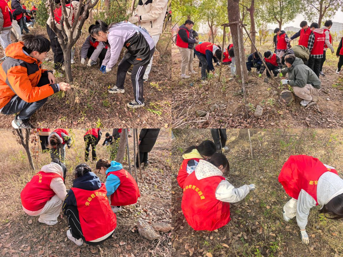 活动中,同学们分组劳作,俯身田间,清理杂草、扶正幼苗。在“稼穑学堂”教师的指导下,大家学习辨认作物,分工协作,默契配合。有人细心清理树旁的杂草,有人负责将杂草归类清运。汗水浸湿衣背,热情却丝毫不减。经过共同努力,原本略显杂乱的土地变得整齐有序,焕发出勃勃生机。