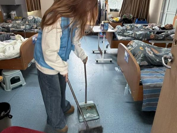 队员们有的主动承担文件档案整理工作,细心梳理老人档案、护理记录,核对补充模糊字迹,为养老院规范化管理减负助力;有的走到老人房间,为老人们轻轻捶背,缓解老人们的身体疲惫与酸痛;有的开展全区域卫生打扫,手持扫帚、抹布等工具,擦拭门窗、清理垃圾,用实际行动为老人们打造了整洁、温馨的居住环境。
