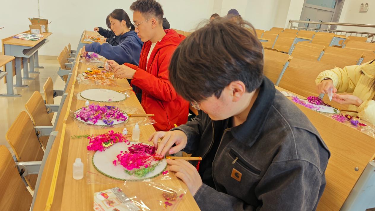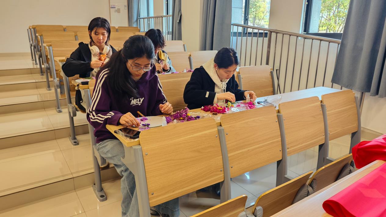 干花相框画制作环节中,同学们将春日美好定格于方寸之间。大家认真书写祝福话语与新学期目标,或相互赠送传递心意,或共同布置春日花墙。以手作传情,以创意暖心,在安静创作中释放压力、涵养心灵。