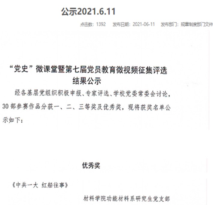“党史”微课堂暨第七届党员教育微视频征集评选——优秀奖;时间:2021年6月