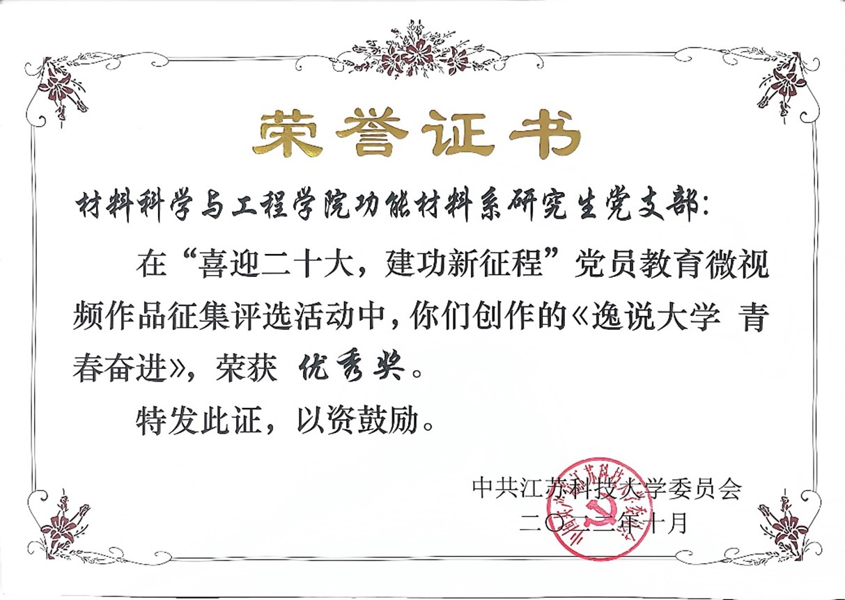 “喜迎二十大,建功新征程”党员教育微视频征集评选——优秀奖;时间:2022年10月